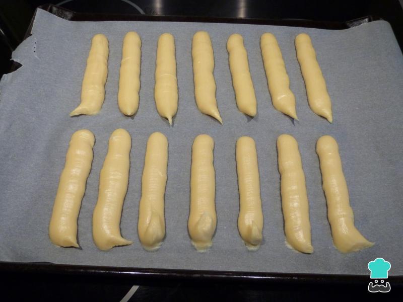 Com a massa pronta, coloque num saco de confeiteiro e desenhe "salsichas" num tabuleiro de forno forrado com papel manteiga. Não deposite massa demais, pois ela irá crescer bastante. Leve a assar no forno preaquecido a 180ºC por cerca de 20 minutos, ou até dourar.