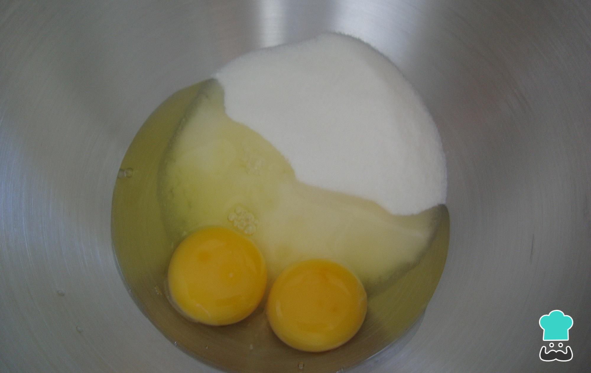 Enquanto a massa choux assa, prepare o recheio dos éclairs au chocolat, que será creme de confeiteiro ou, em francês, crème pâtissière. Comece por misturar o ovo, a gema de ovo, o açúcar e o amido de milho numa vasilha.
