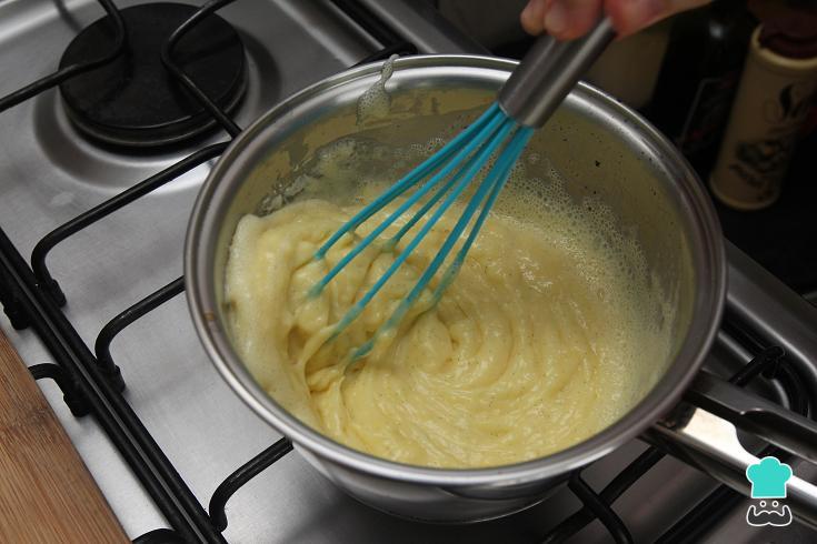 Acrescente o leite e a essência de baunilha e misture novamente. Leve ao fogo médio, mexendo sempre e, quando a mistura engrossar, baixe o fogo e cozinhe por mais 3 minutos.