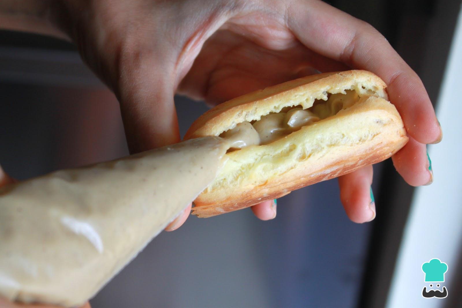 Quando a massa estiver assada, deixe esfriar um pouco e recheie o creme anterior. Você pode fazer isso de duas formas: abrindo os éclairs ao meio ou fazendo um furinho numa das pontas e inserindo o creme com um saco de confeiteiro.