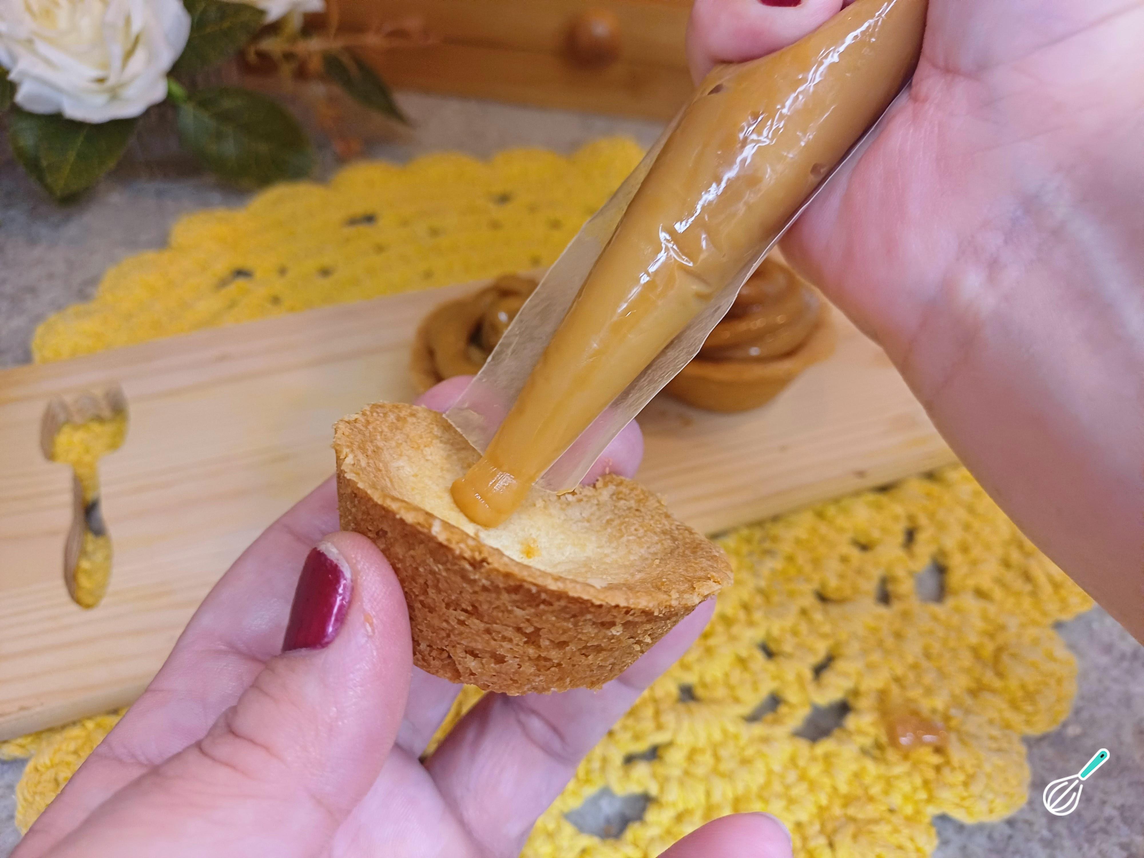 Coloque o doce de leite em um saco de confeitar e corte o bico não muito fino. O doce de leite deve estar cremoso, se a consitência estiver muito dura, misture creme de leite até ficar cremosa e fácil confeitar. Espalhe o recheio dentro das empadas.