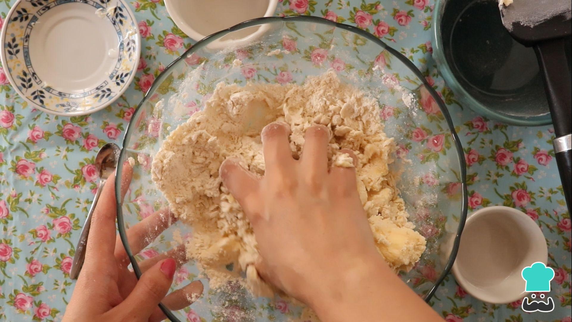 Misture todos os ingredientes, exceto o leite condensado, em uma tigela. Comece misturando com uma colher e, quando chegar neste ponto, mão na massa!