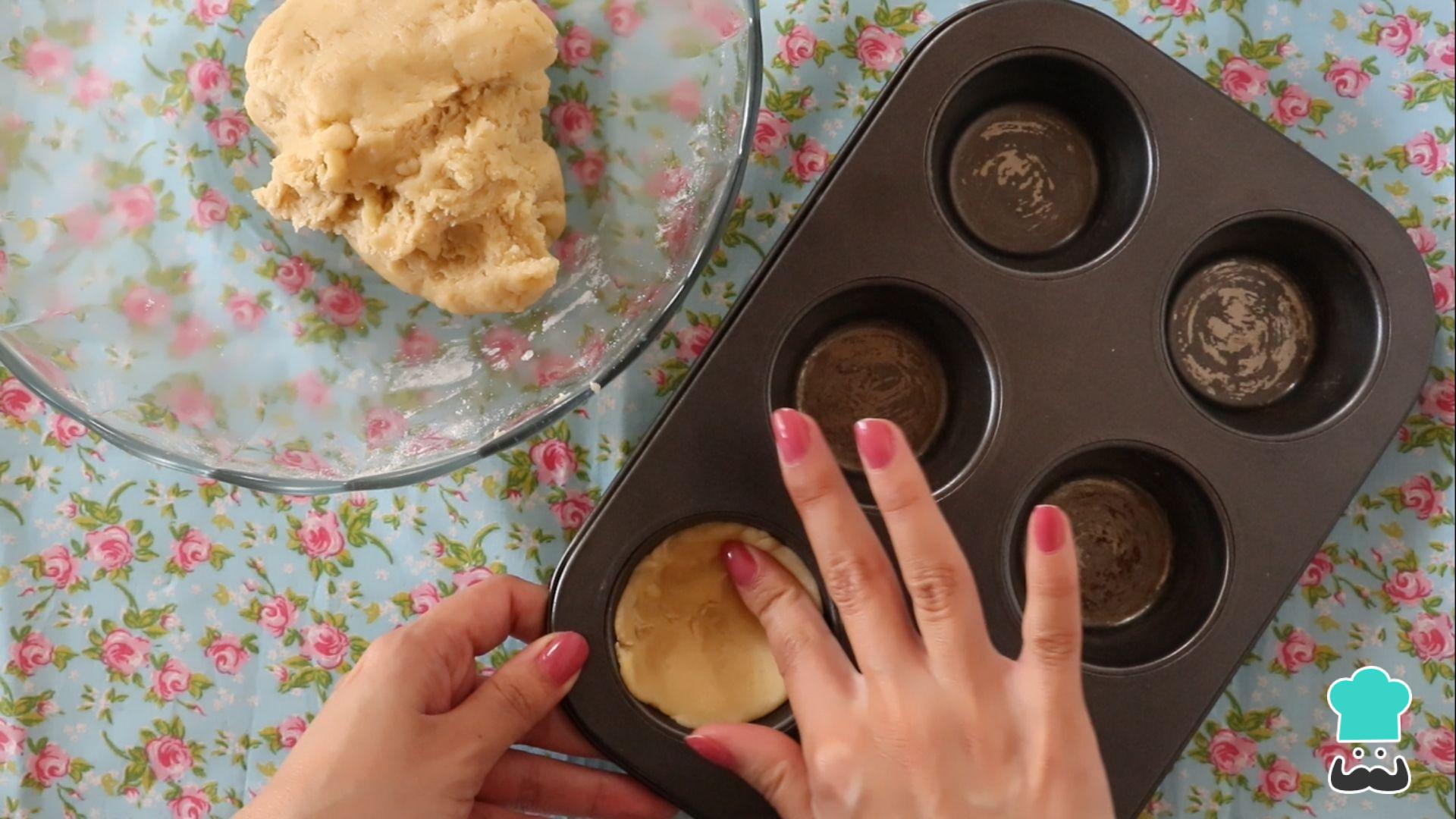 Pegue uma porção da massa e forre o fundo e as laterais da sua forma. Faça uma camada fina e uniforme para as suas empadas de leite condensado assarem uniformemente. Não precisa untar!