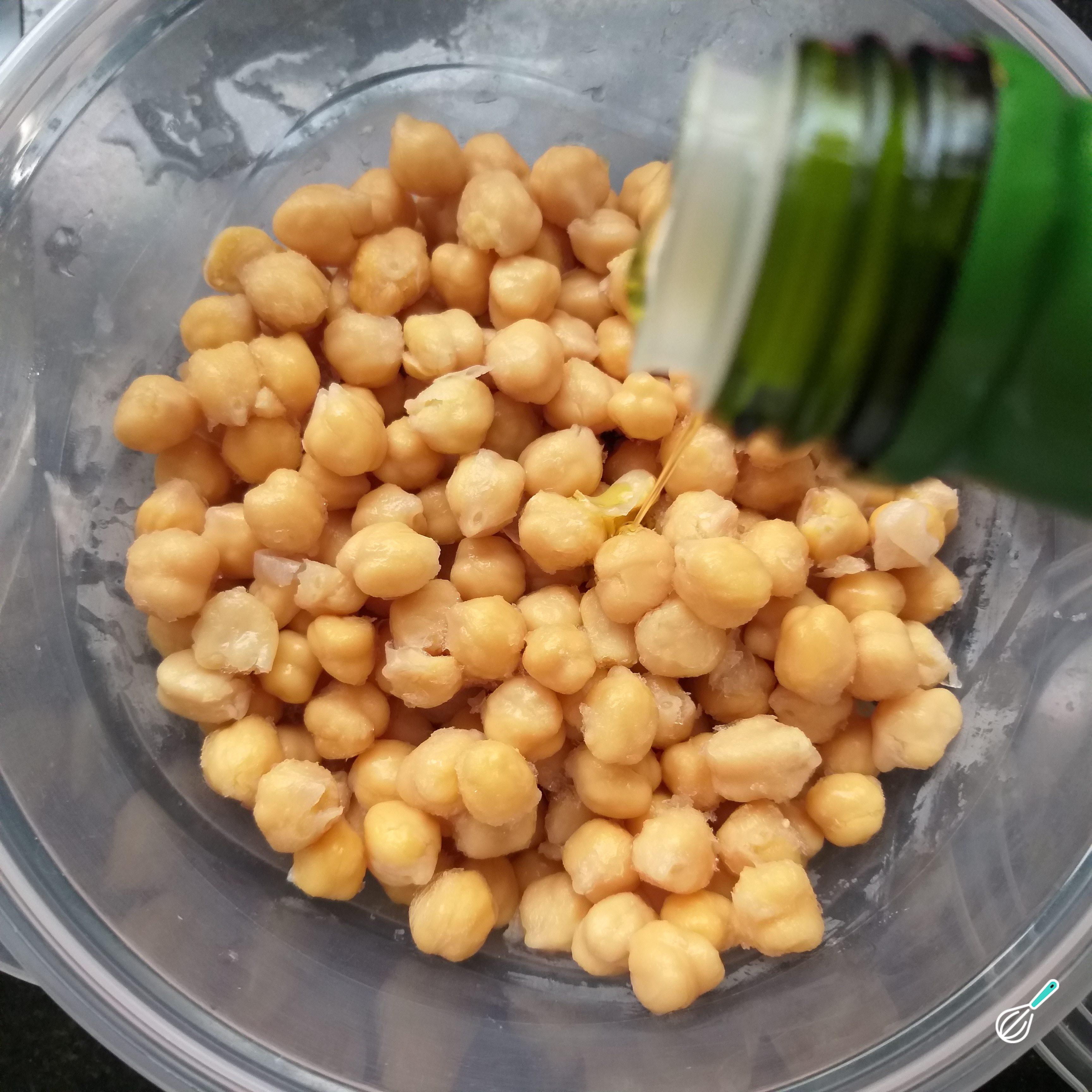 Preaqueça o forno nos 200ºC (forno alto) e separe os grãos de bico cozidos - você pode utilizar a opção em lata ou cozinhar os grãos secos.