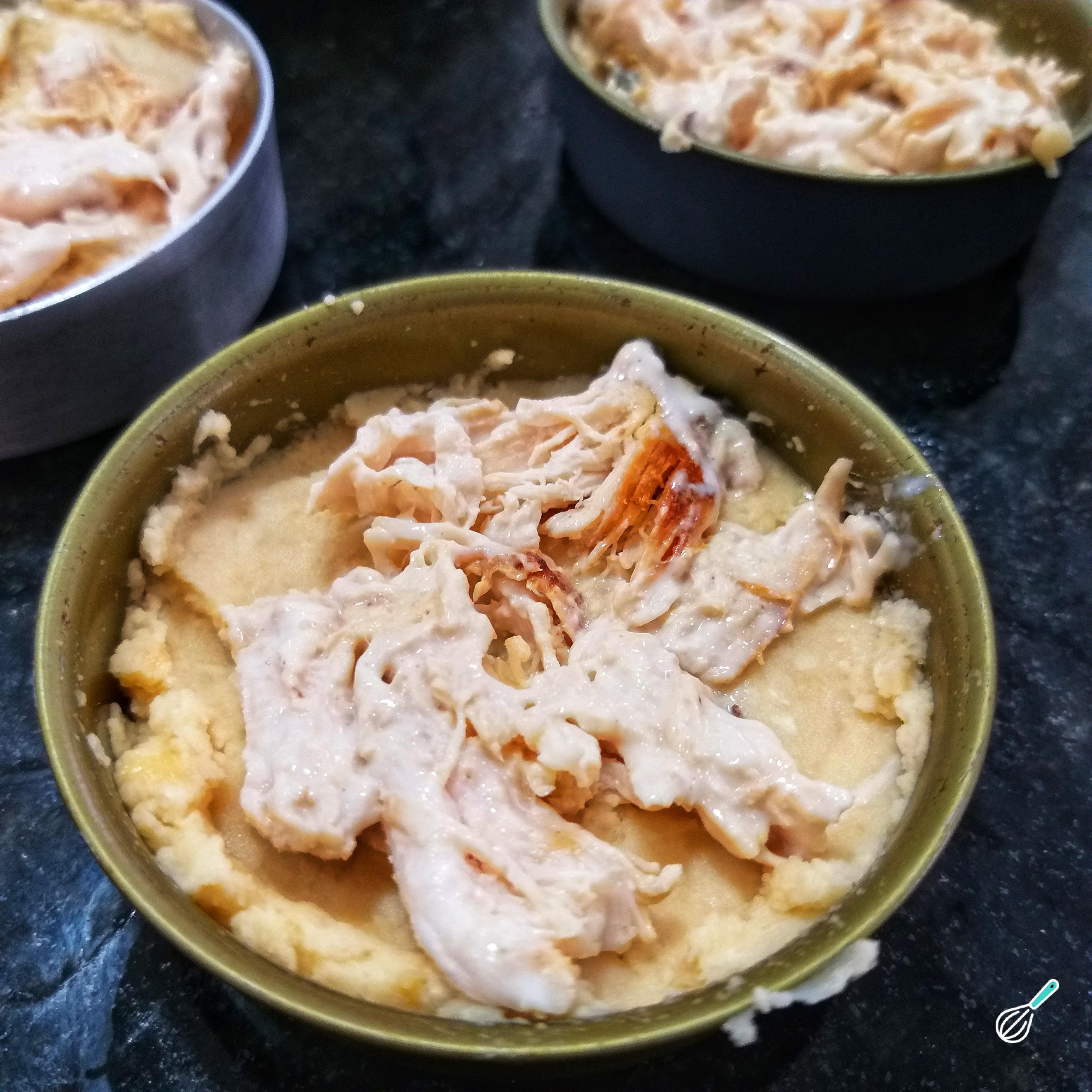 Coloque uma parte da massa em forminhas, acrescente o recheio (no caso, o frango desfiado com requeijão) e cubra com o restante da massa.