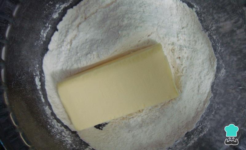 O primeiro passo da receita de empadão é preparar a massa. Para isso amasse a farinha com a manteiga até obter uma farofa.