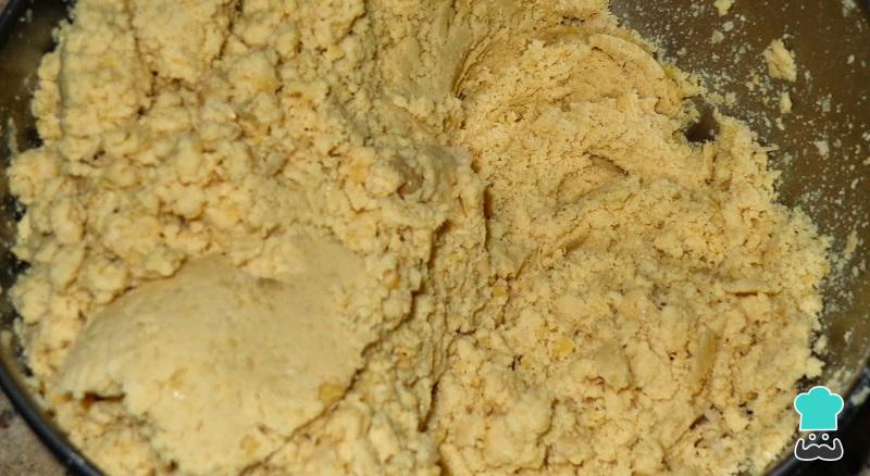 Seguidamente adicione a essa farofa os restantes ingredientes respetivos e amasse muito bem com as mãos até ficar lisa e homogênea. Embrulhe a massa em papel filme e leve à geladeira por 15 minutos.