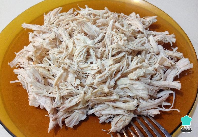 Comece agora preparando o recheio do empadão. Se estiver usando sobras, desfie o frango; caso esteja usando cru, coloque-o cozendo em água com sal e o tablete de caldo e desfie depois de cozinhado e esfriado.