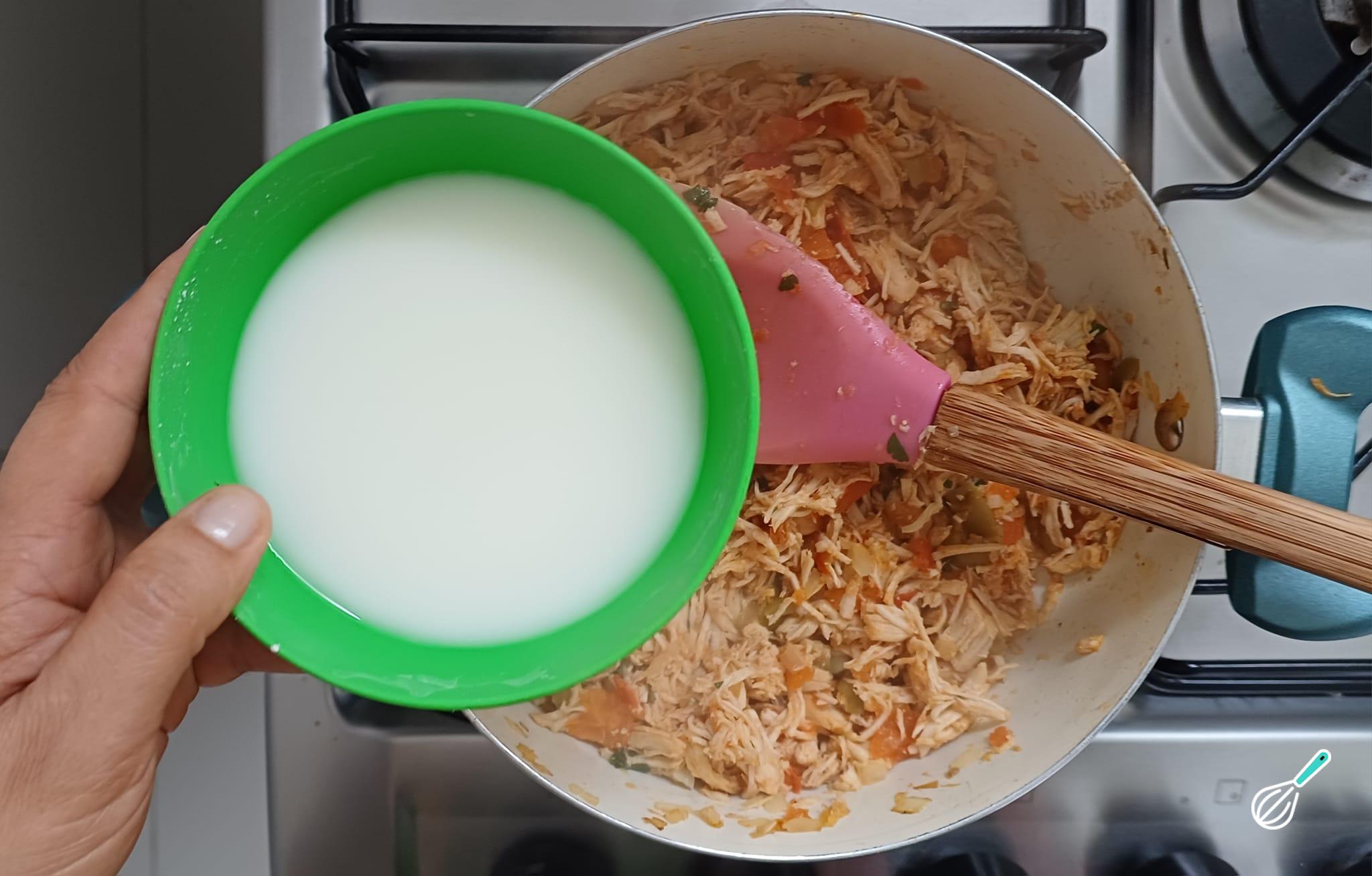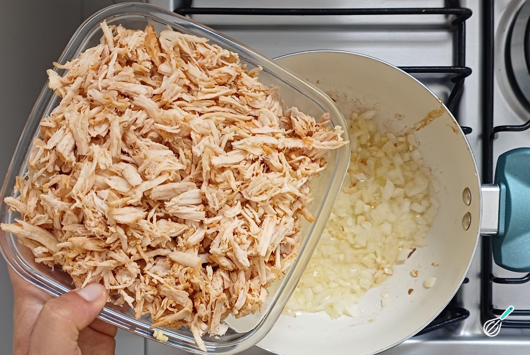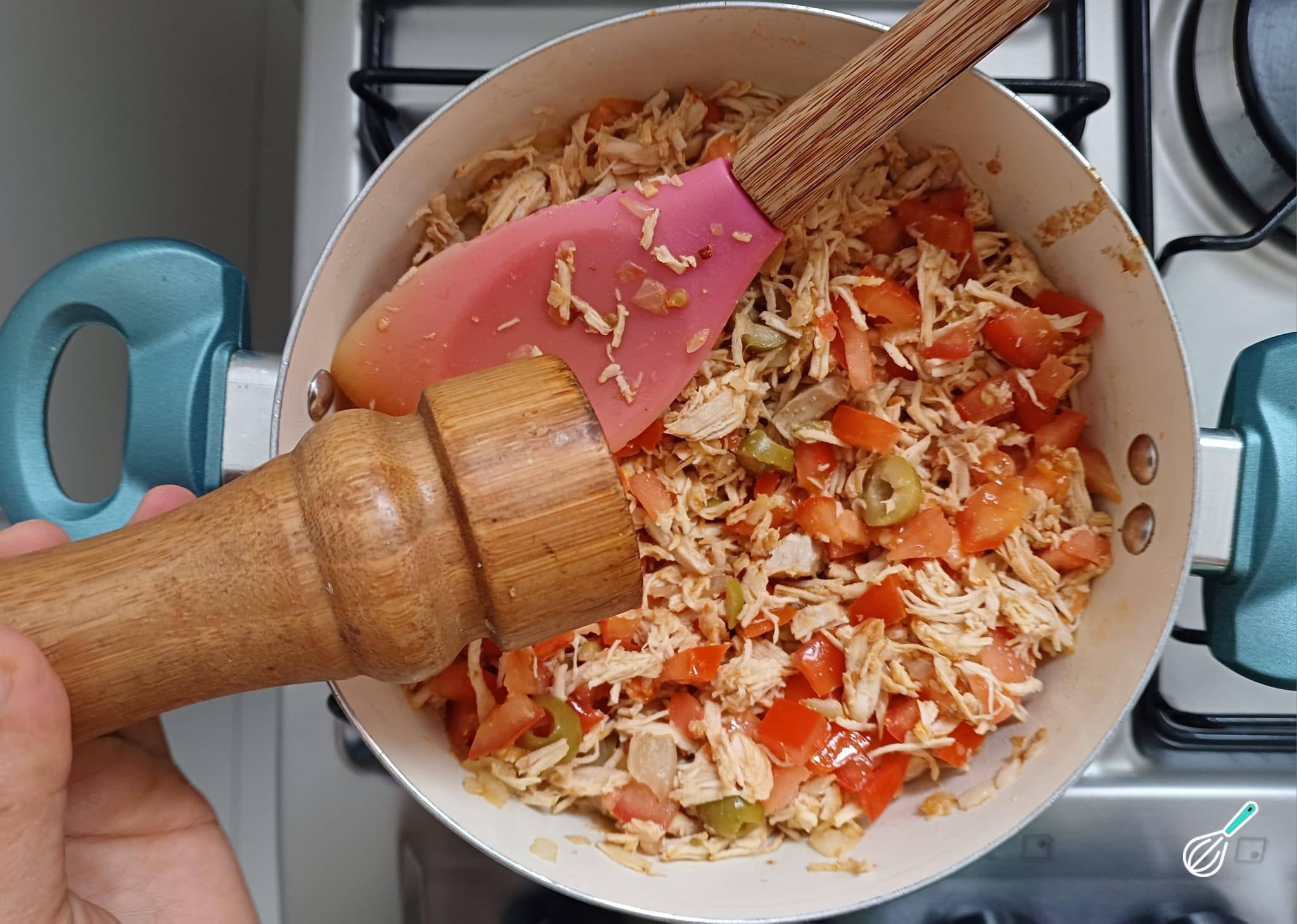 Adicione o frango cozido e desfiado e refogue mais um pouco.