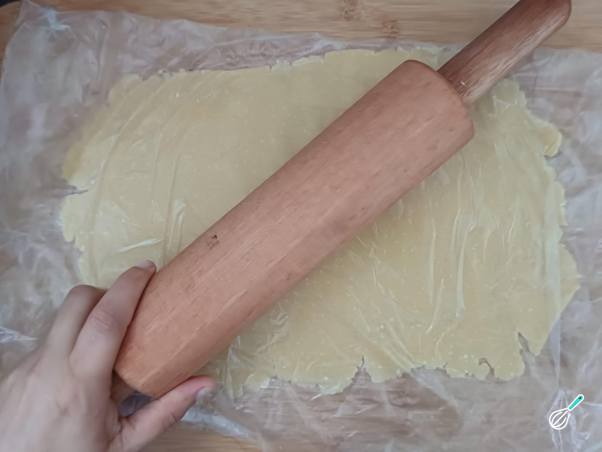 Abra 2/3 da massa (acomode-a entre 2 sacos para evitar que grude no rolo) para cobrir o fundo e a lateral de um refratário médio.