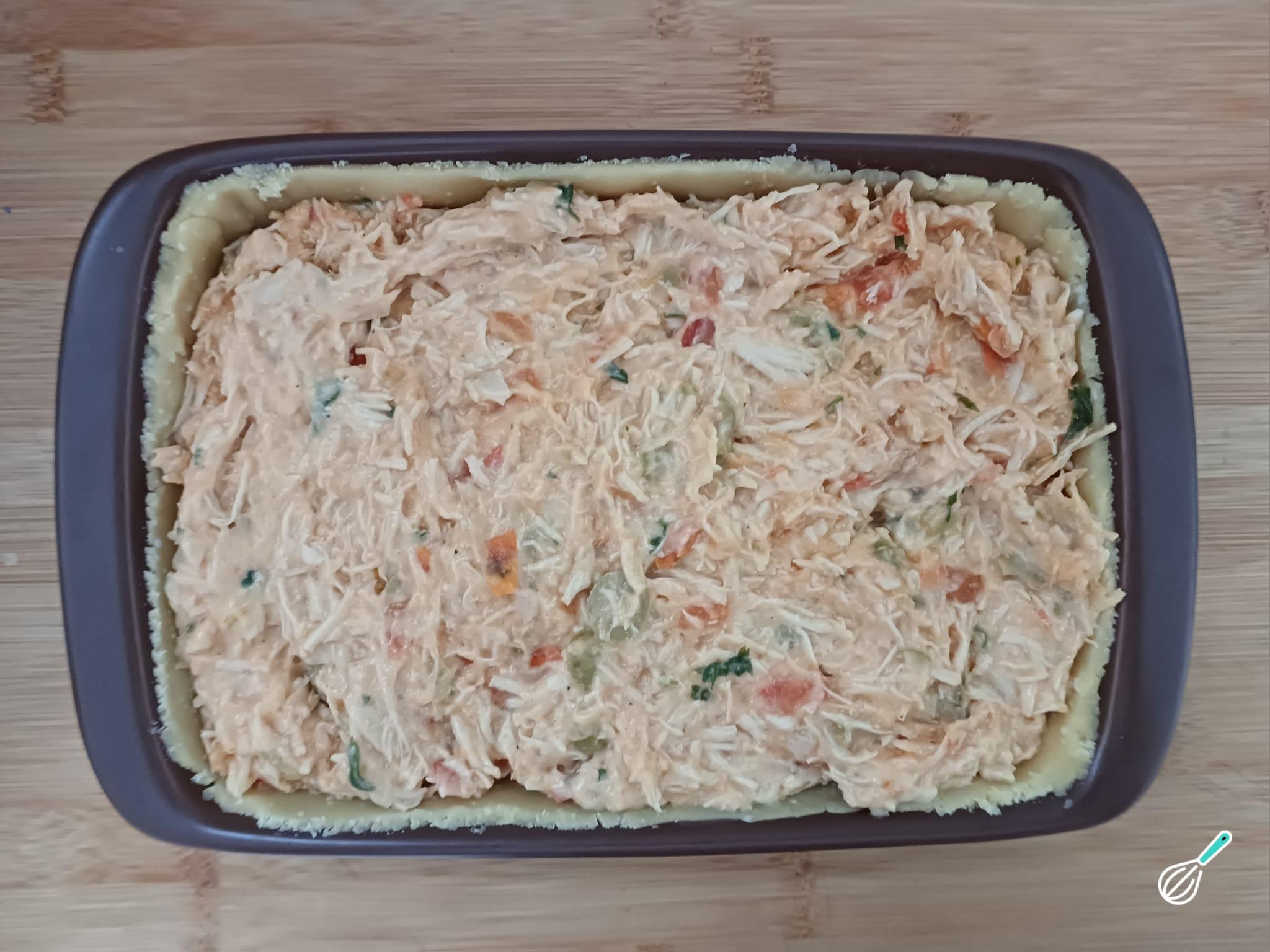 Forre o refratário com a massa (sem necessidade de untar) e preencha com o recheio cremoso de frango.