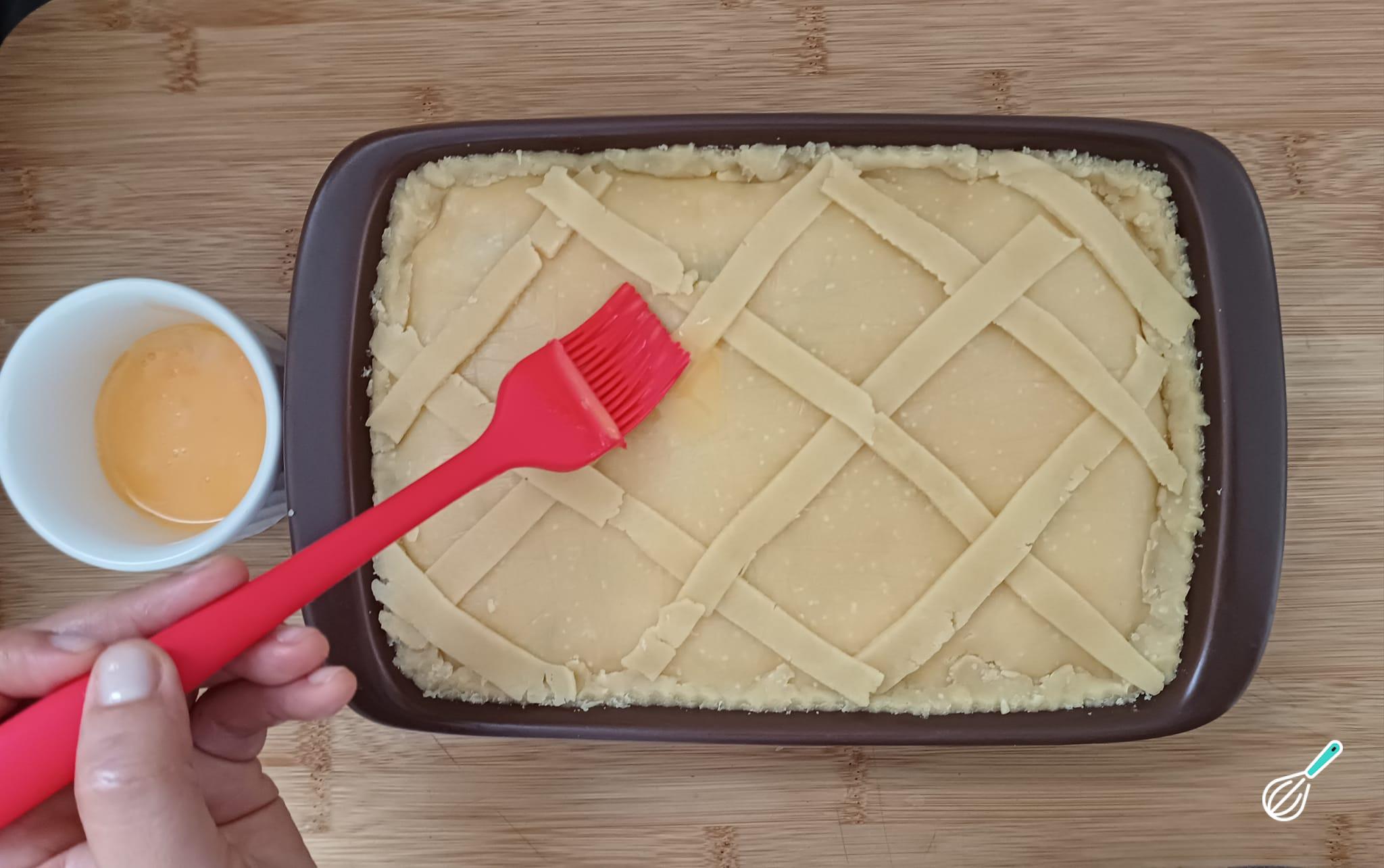 Pincele com gema e leve para assar em forno preaquecido a 180 graus por 40 minutos ou até dourar levemente.