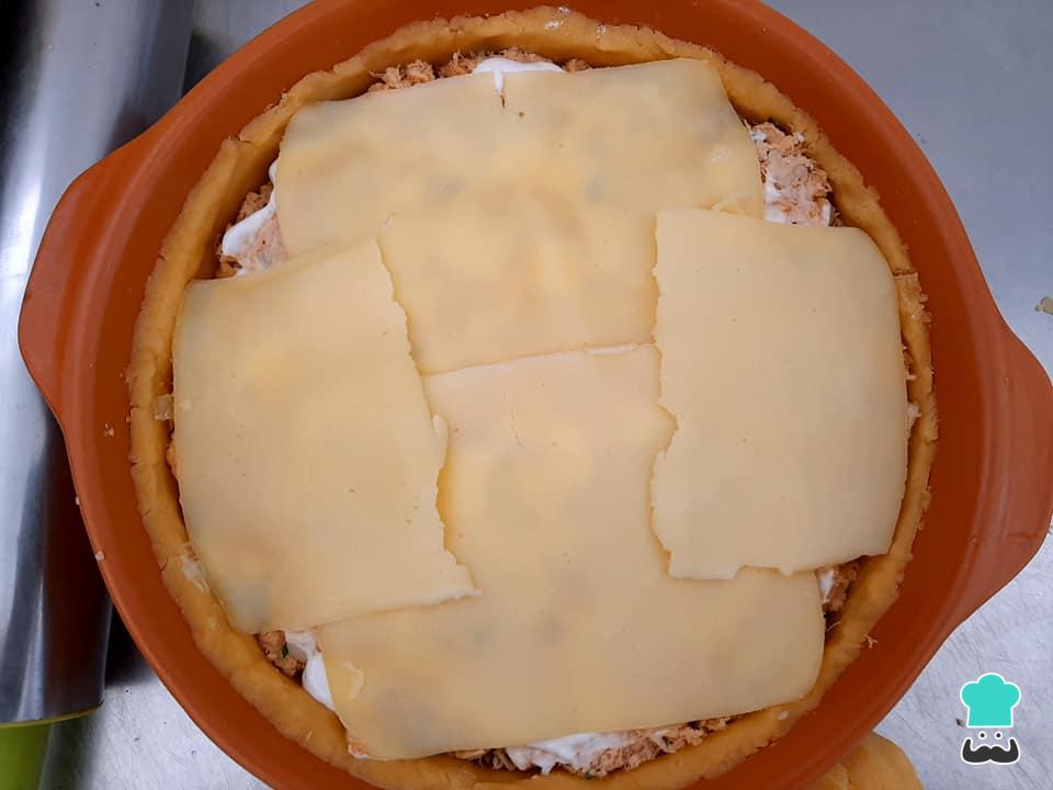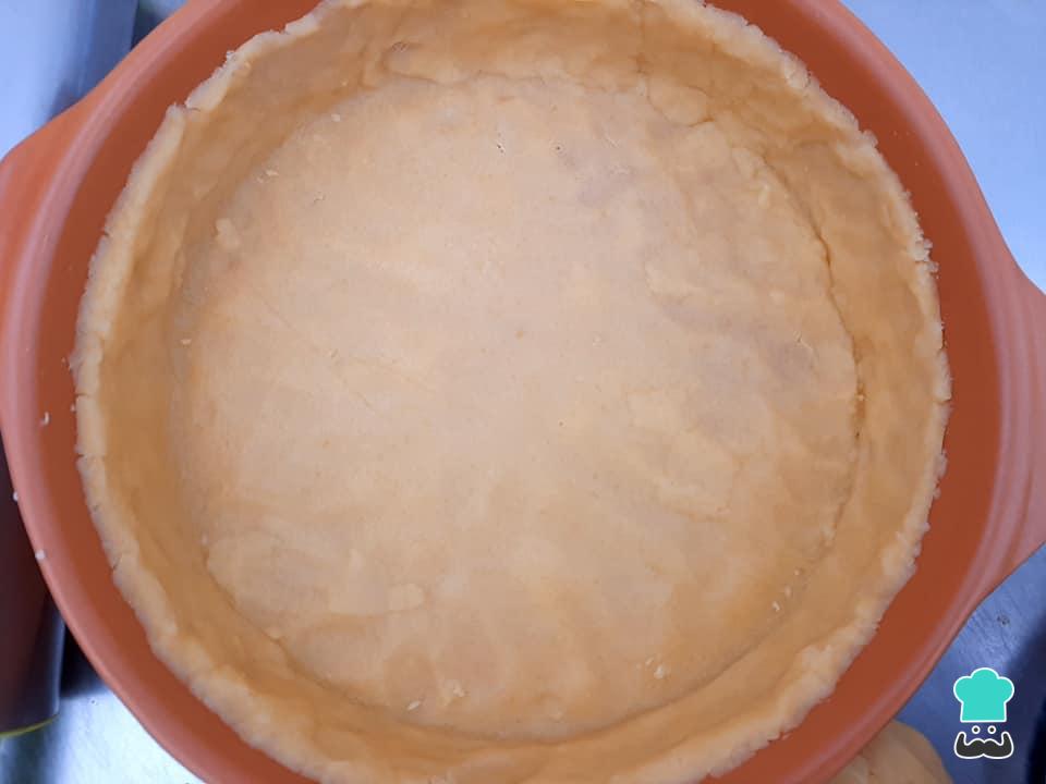 Numa forma média, untada com manteiga, forre o fundo e as laterais com a massa.