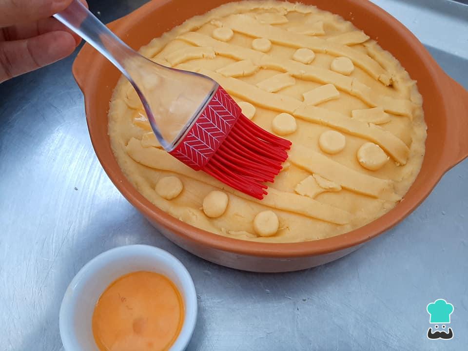 Feche o empadão com a massa restante e decore como desejar. Pincele com a gema de ovo e leve para assar em forno pré aquecido a 180-200 graus por aproximadamente 40 minutos ou até dourar levemente.