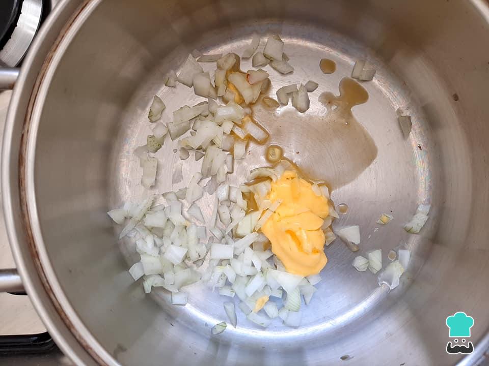 Aqueça a manteiga numa panela média e, em seguida acrescente a cebola picada, refogando um pouco.