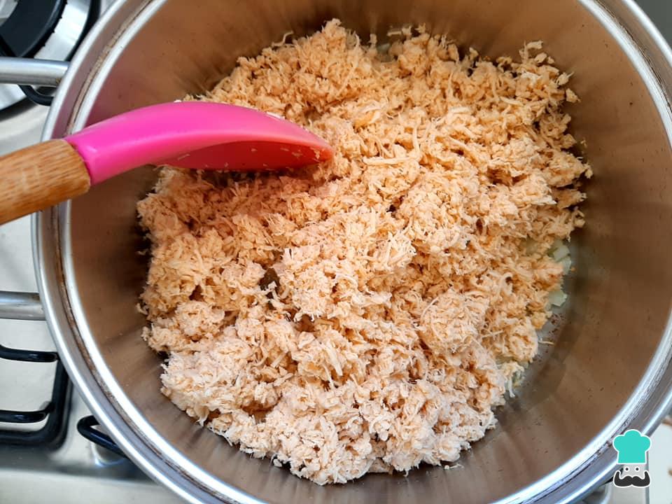 Adicione o alho picado e deixe refogar mais um pouco. Acrescente o frango cozido e desfiado e refogue alguns minutos.