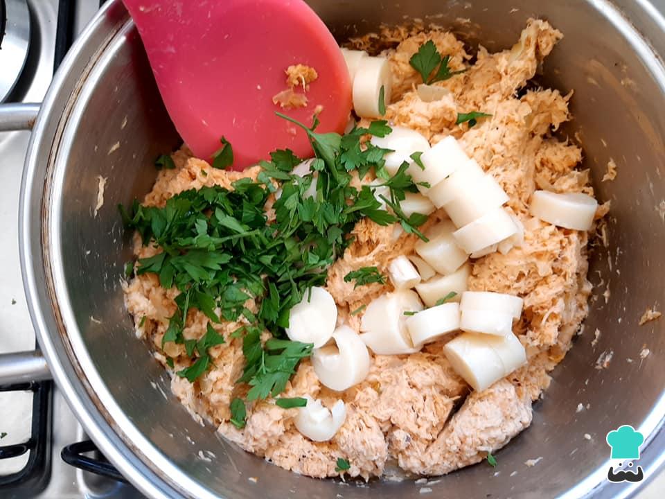 Junte ao refogado de frango o molho de tomate, o sal, a pimenta do reino e misture bem. Logo em seguida, adicione o leite misturado com a farinha de trigo (bem diluída) e misture o refogado, mexendo até ganhar consistência mais cremosa. Acrescente a salsa picada e o palmito e misture tudo.