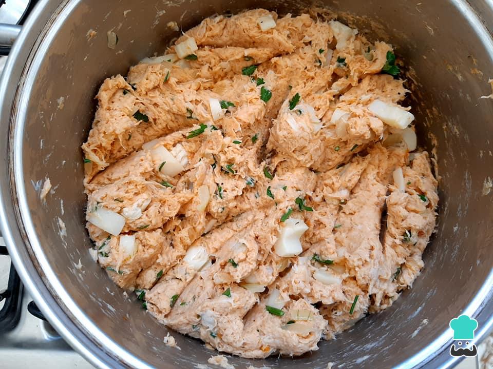 Espere amornar um pouco e junte o requeijão cremoso no recheio. Reserve-o enquanto prepara a massa do empadão.