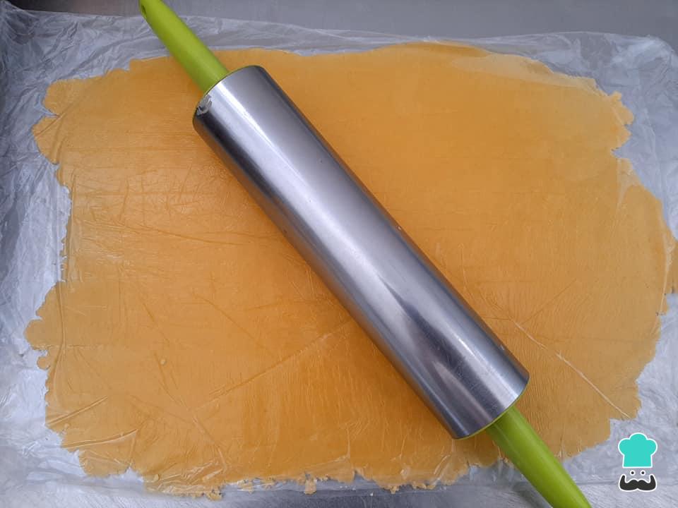 Com o auxílio de um rolo, abra a massa (sem deixar com espessura muito fina) entre dois plásticos para facilitar o processo e evitar que a massa grude no rolo ou se quebre com facilidade.