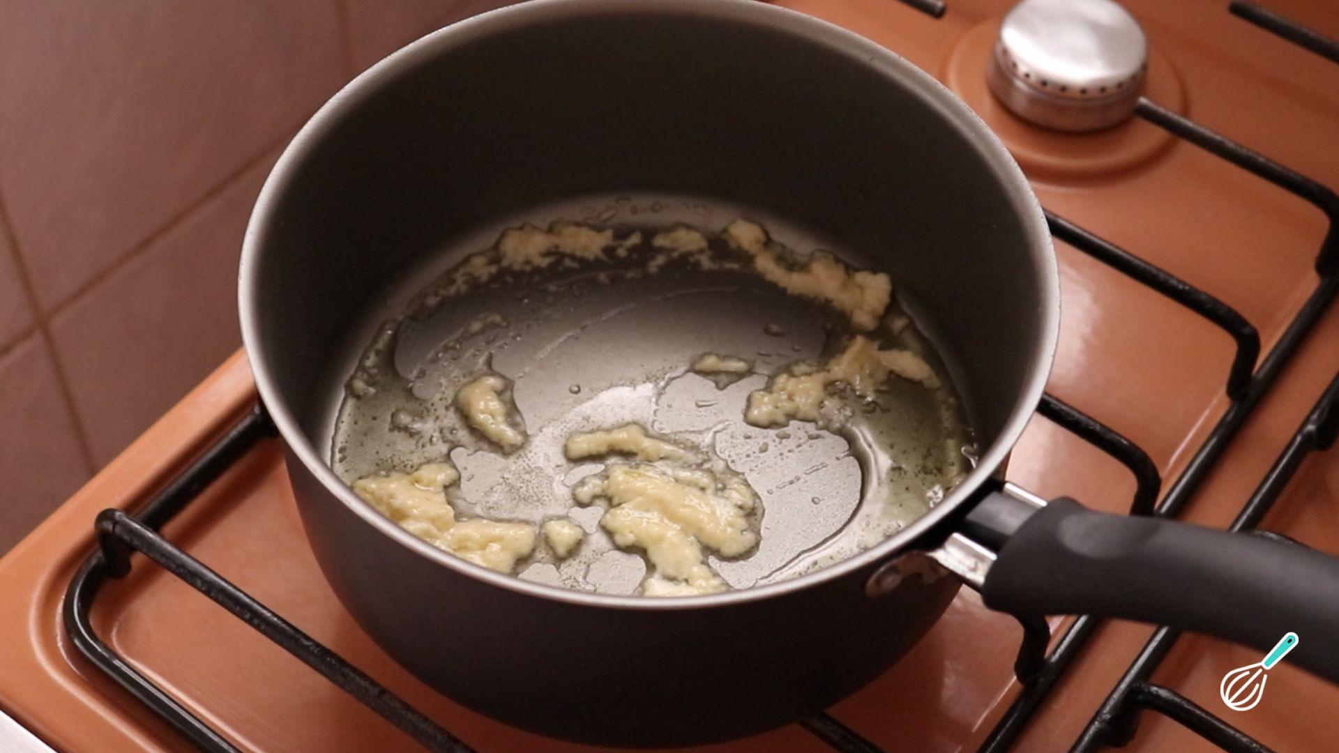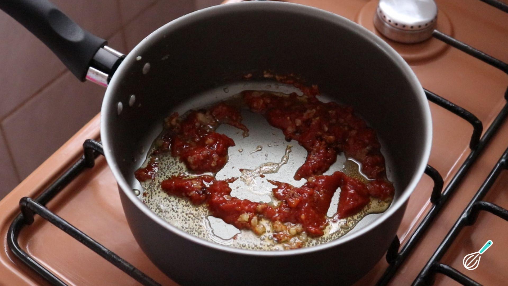 Vamos começar preparando o recheio da sua empadinha de carne moída: leve uma panela ao fogo médio, adicione um fio de azeite e refogue o alho e a cebola picadas.