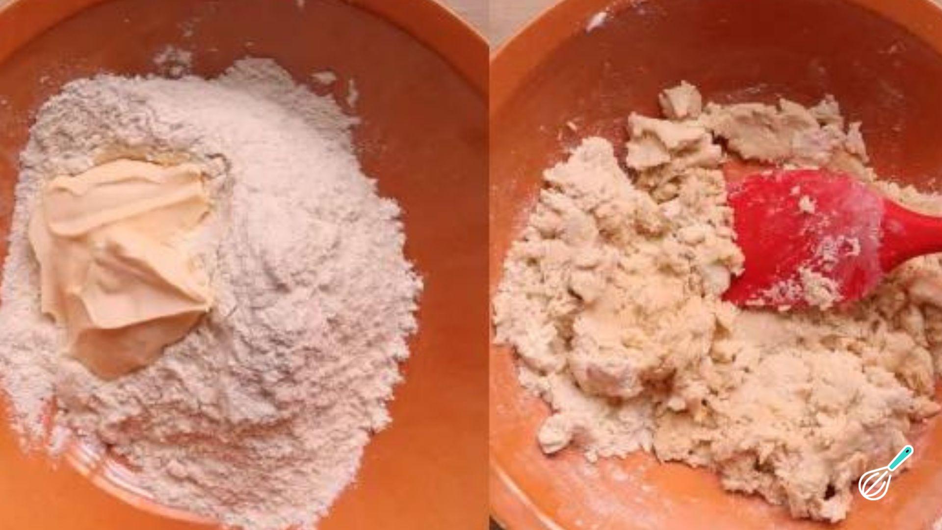 Enquanto isso prepare a massa de empadinha que é super simples: misture a maionese e a farinha de trigo até formar uma massa homogênea e lisa.