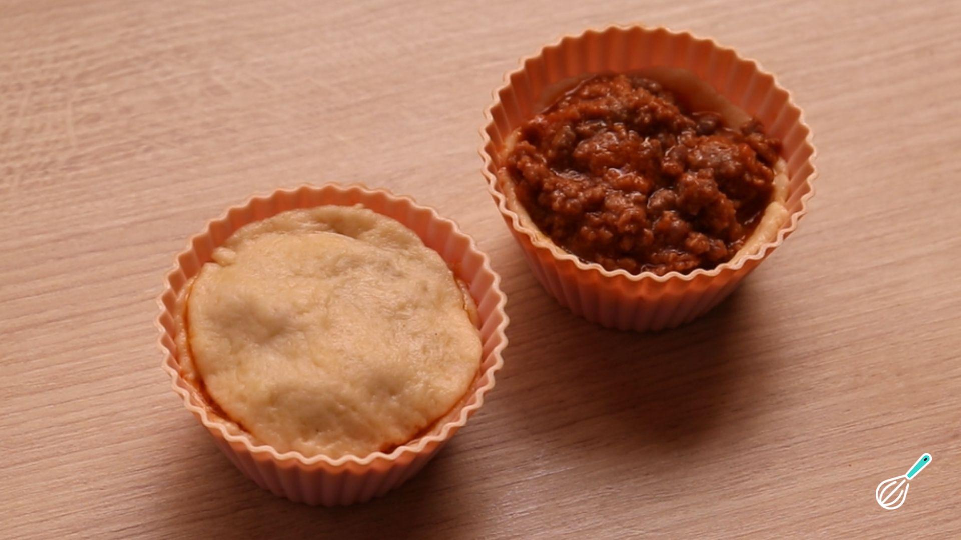 Forre o fundo e as laterais de uma forma de empadinha (ou de cupcake) com a massa e adicione o recheio de carne moída. Separe um pouco da massa para cobrir a forma.