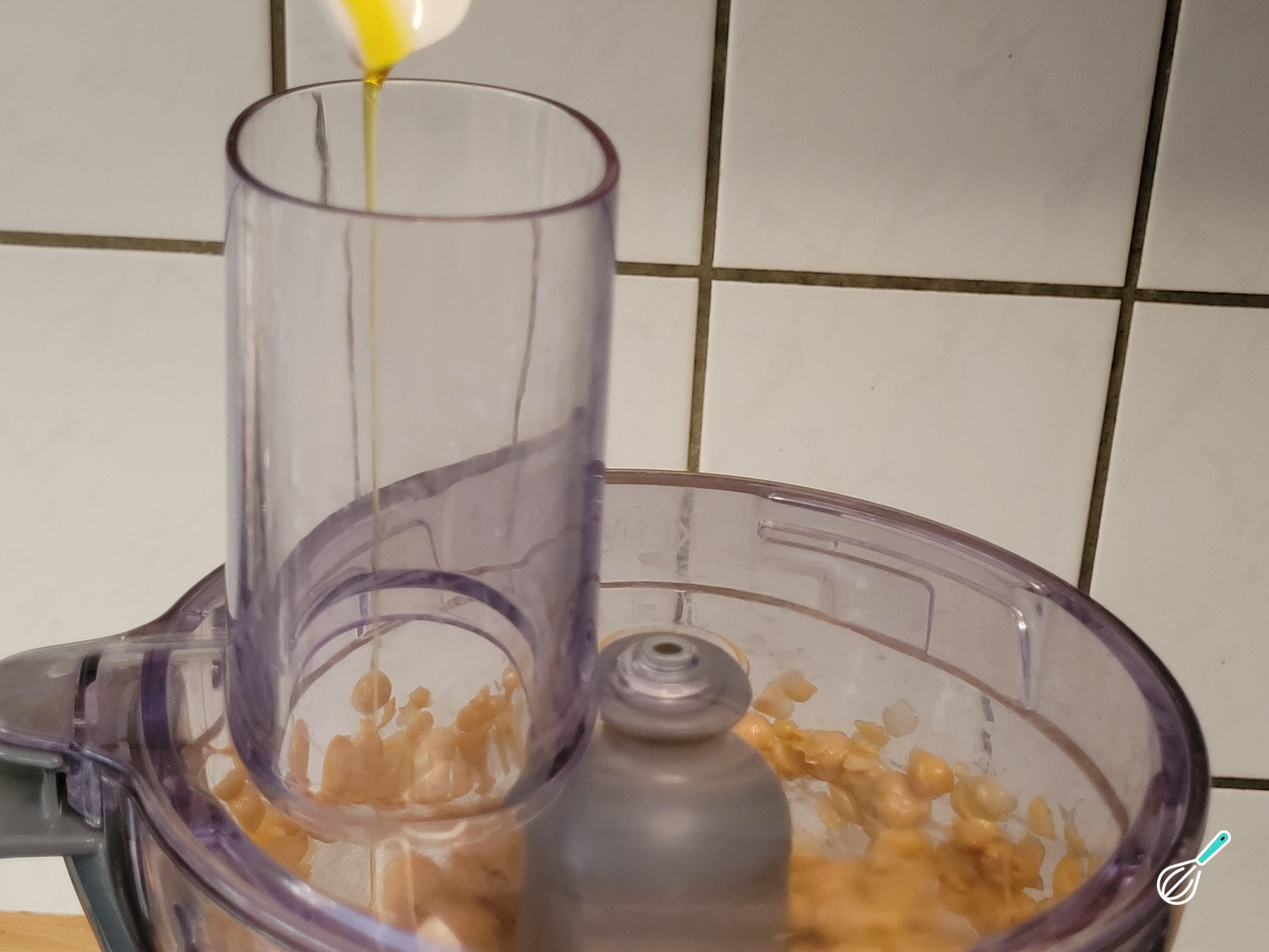 Para fazer a massa, coloque o grão-de-bico já cozido em um processador e vá adicionando o azeite aos poucos até formar uma pastinha. Se necessário, abra o processador e mexa para ajudar a bater.