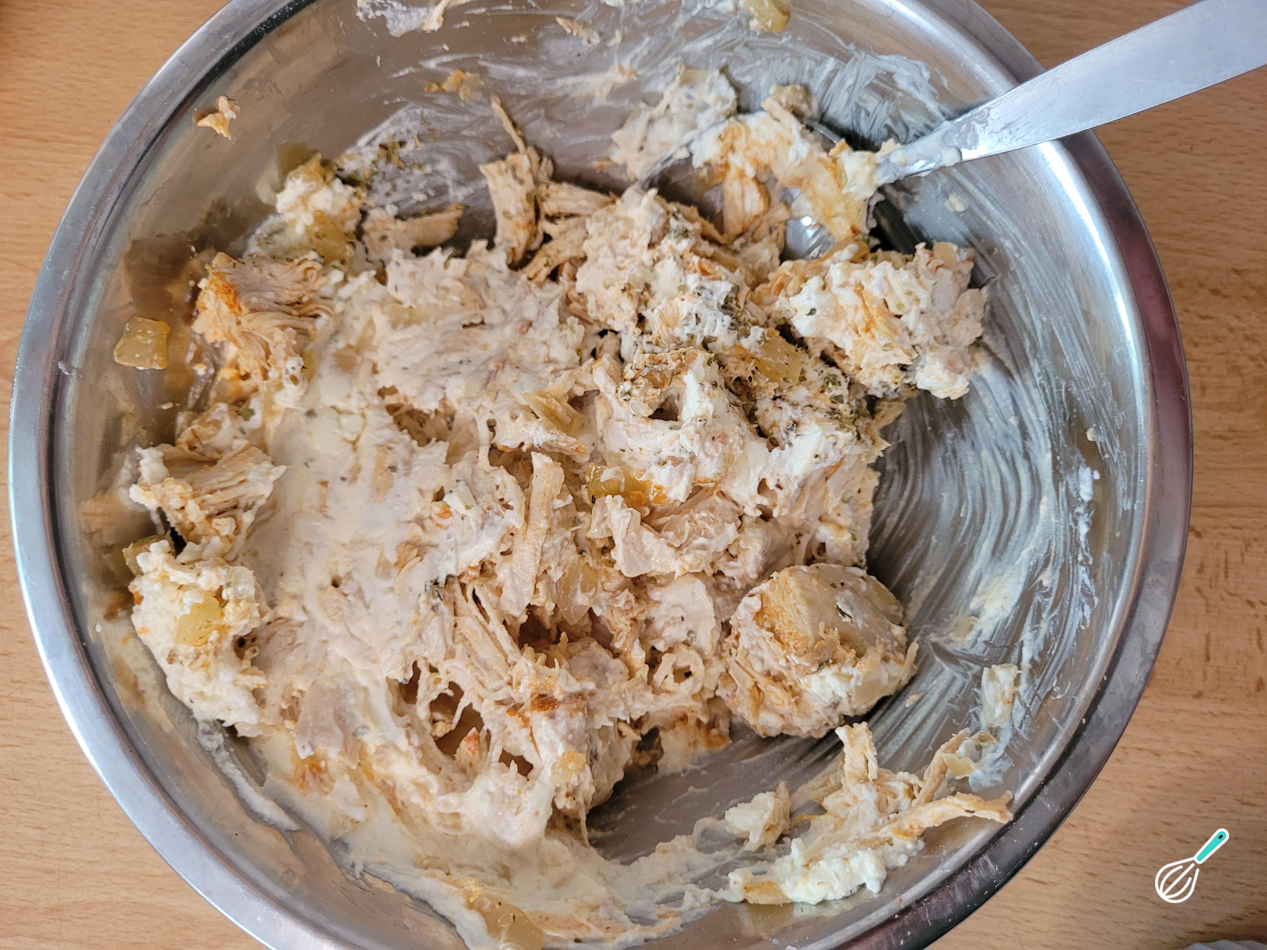 Para o recheio misture o frango com o cream cheese e tempere com orégano, sal e pimenta.