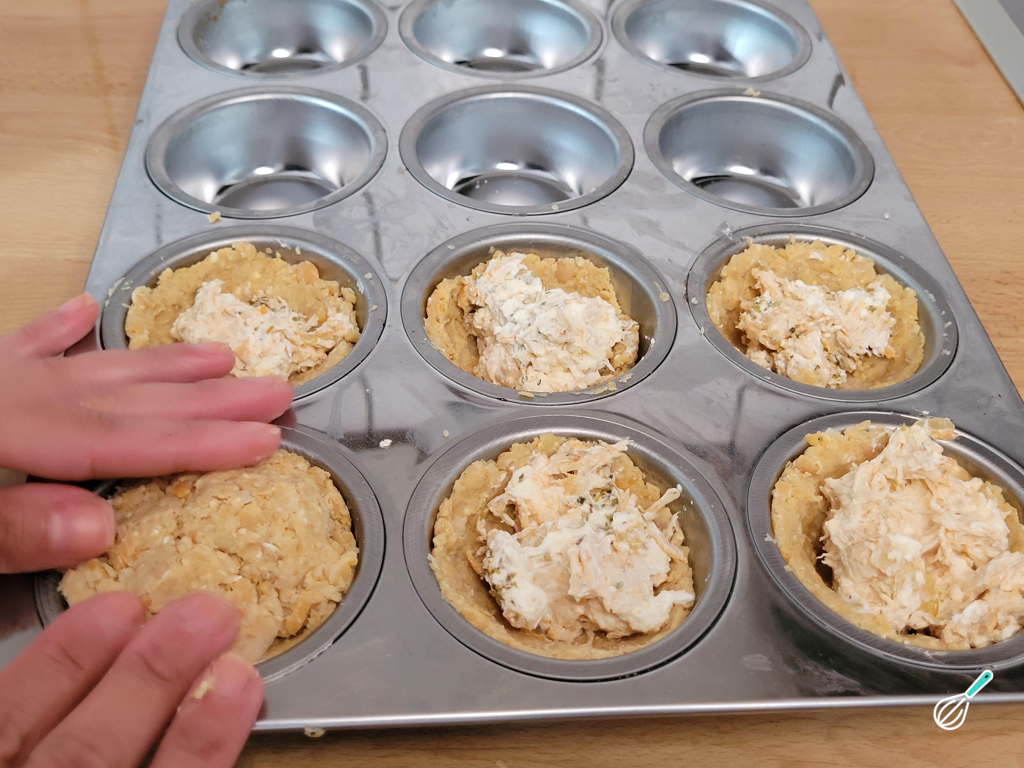 Em forminhas de empadinhas ou forminhas de muffin, coloque metade da massa na base, coloque o recheio e cubra com o restante da massa.