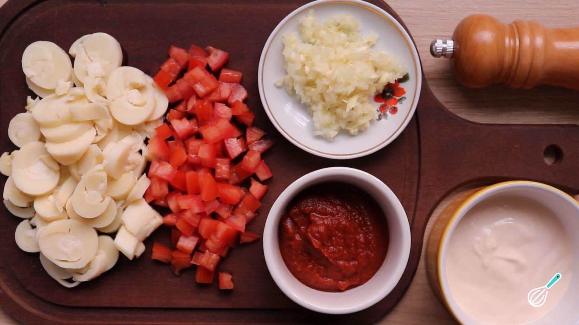 Enquanto isso vamos preparar o recheio: pique o alho e a cebola, corte o tomate em cubos e o palmito em rodelas.