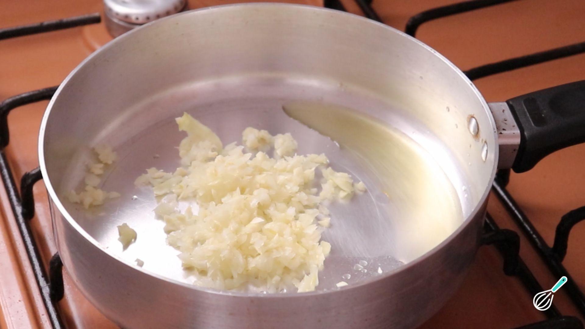 Leve uma panela ao fogo médio, despeje um fio de azeite e refogue o alho e a cebola.
