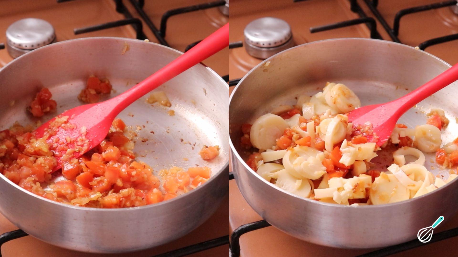 Junte o tomate e o palmito e mexa bem por alguns minutos.