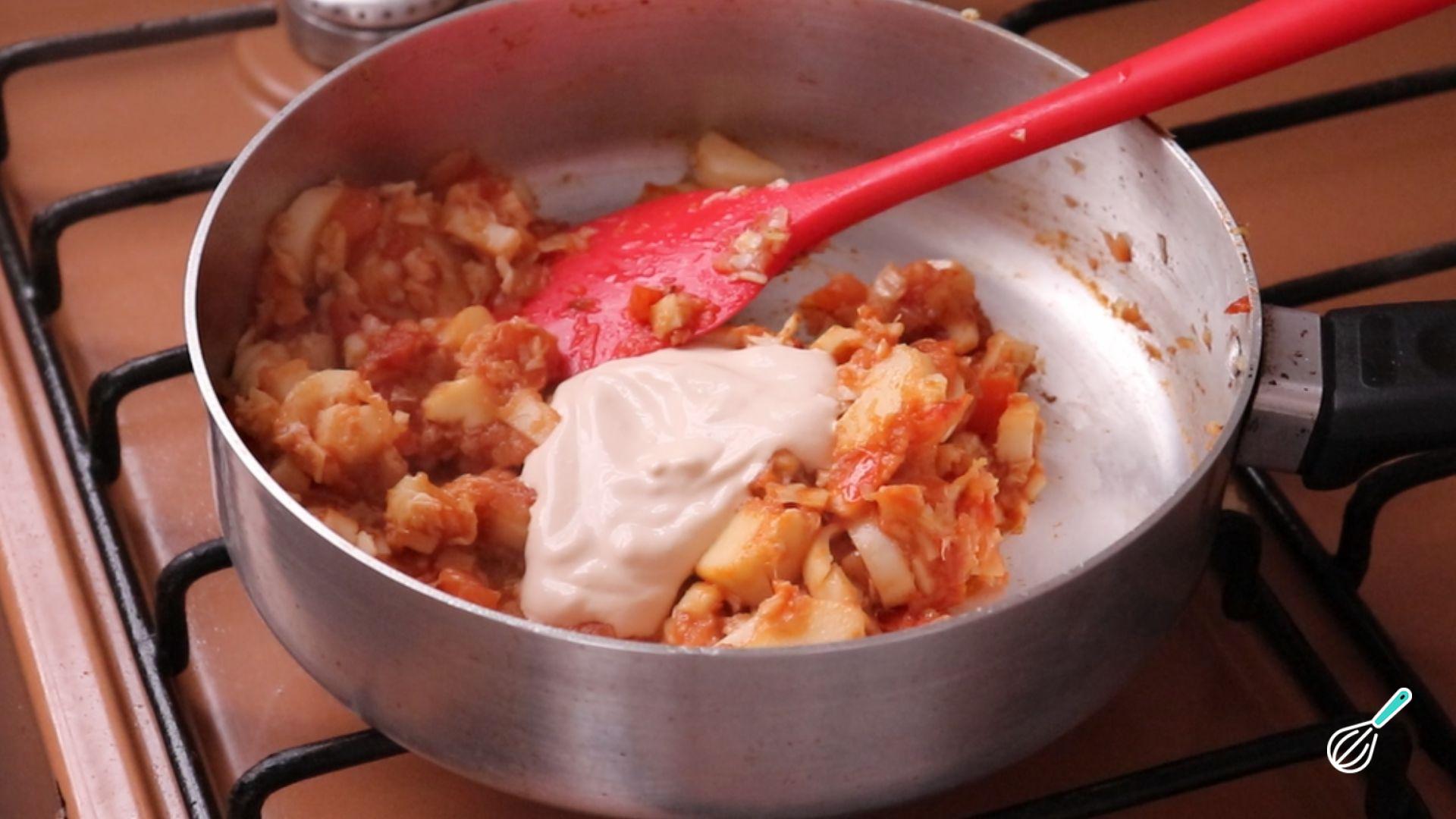 Junte o extrato de tomate e finalize com o creme de leite. Acerte o sal e a pimenta e deixe esfriar.