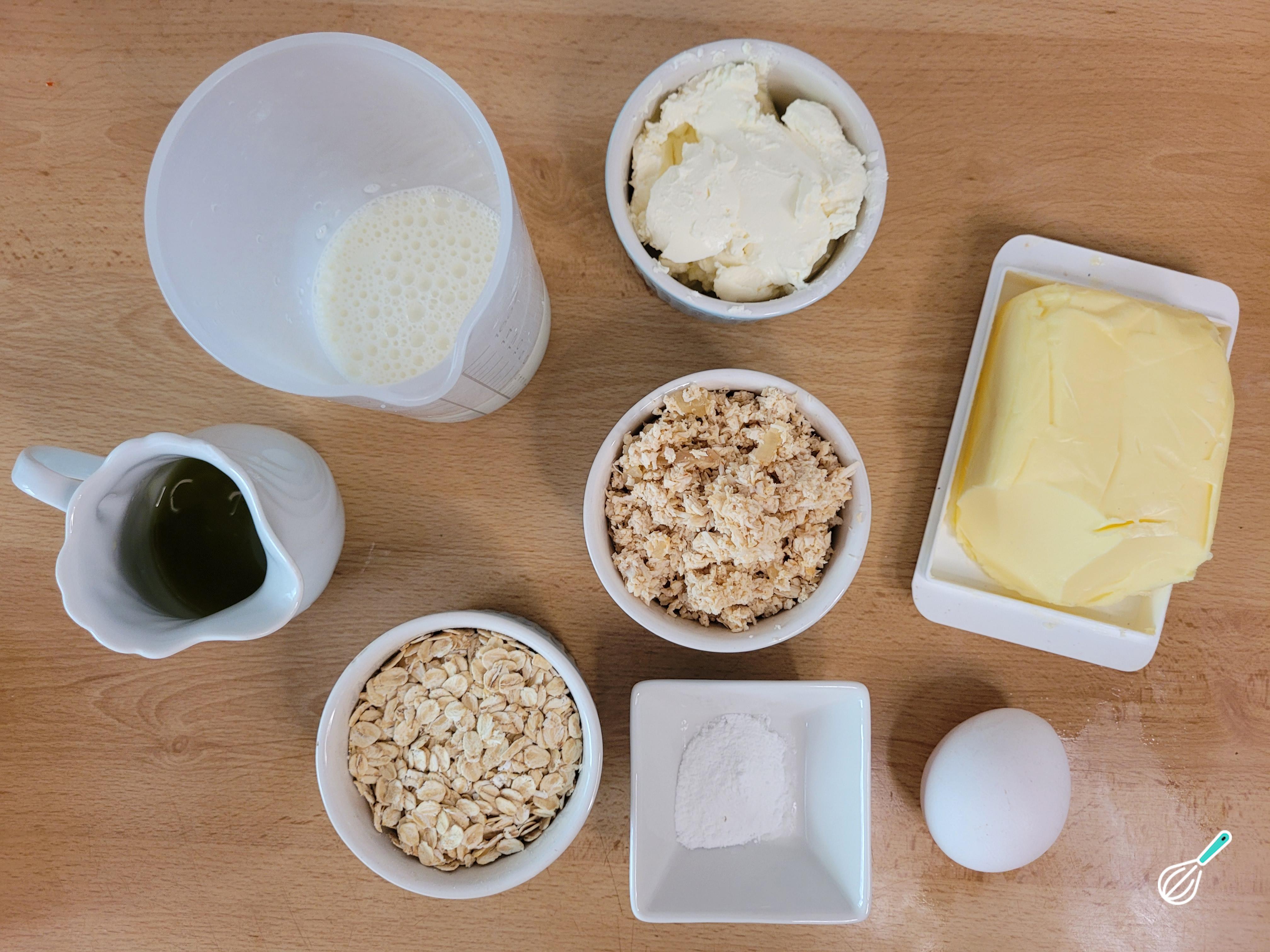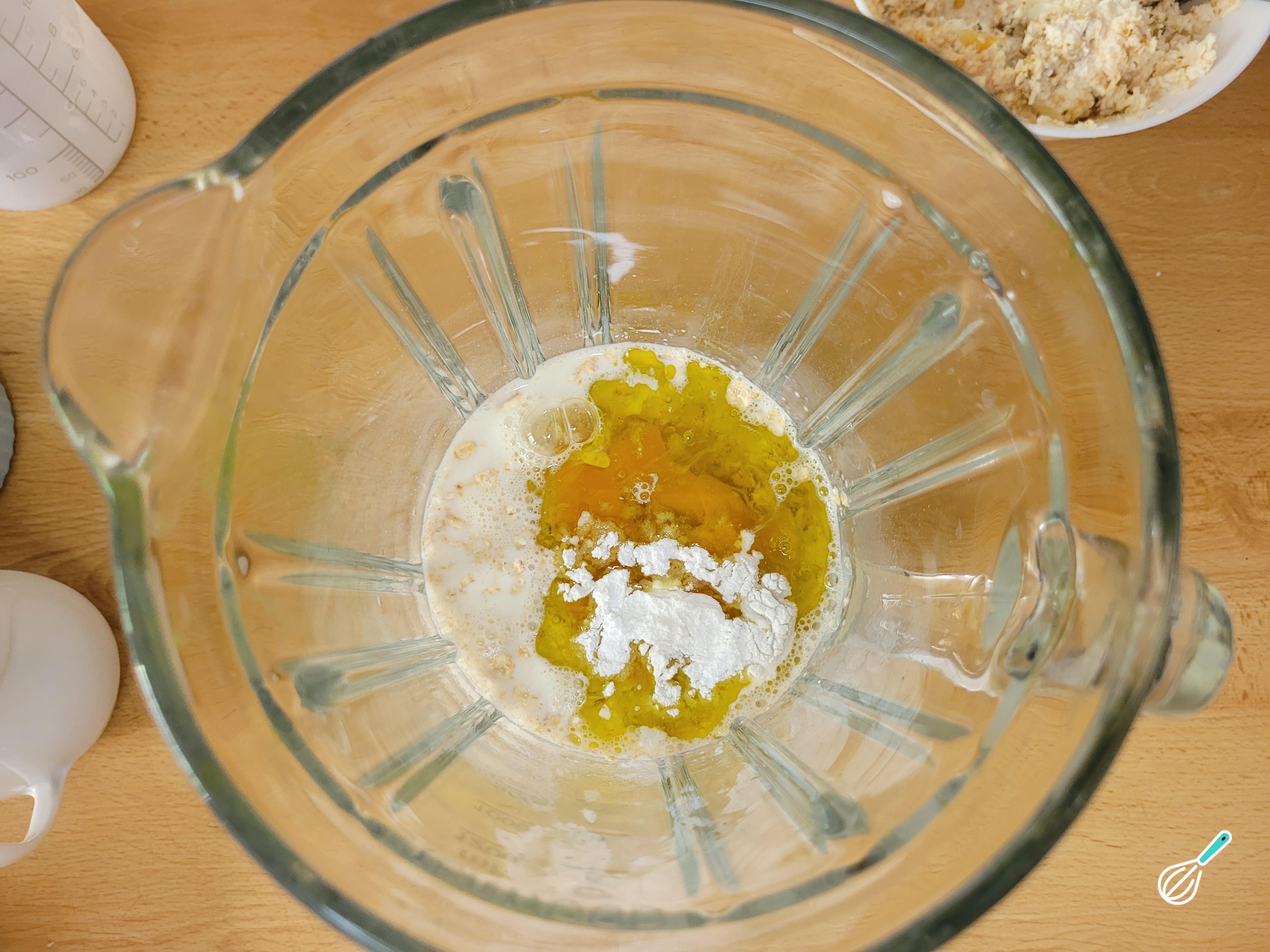 Coloque todos os ingredientes da massa em um liquidificador e bata até ter uma massa consistente. Se a massa estiver muito líquida, adicione um pouquinho mais de aveia ou de farinha de aveia.