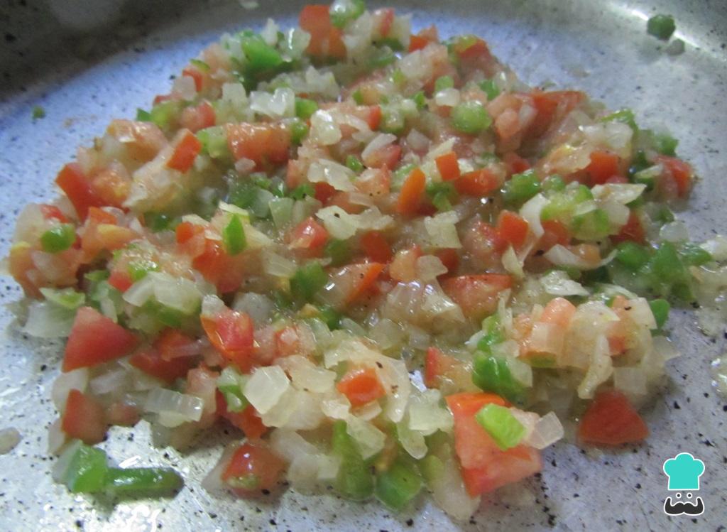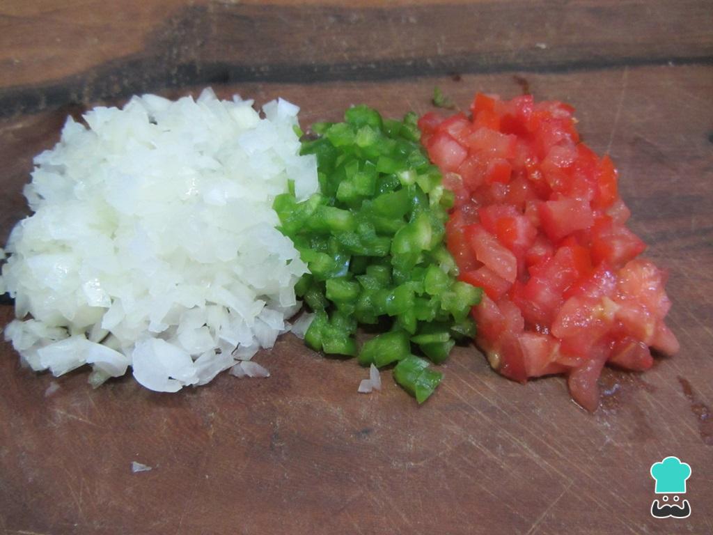 Corte a cebola, o pimentão e o tomate em cubos pequenos.