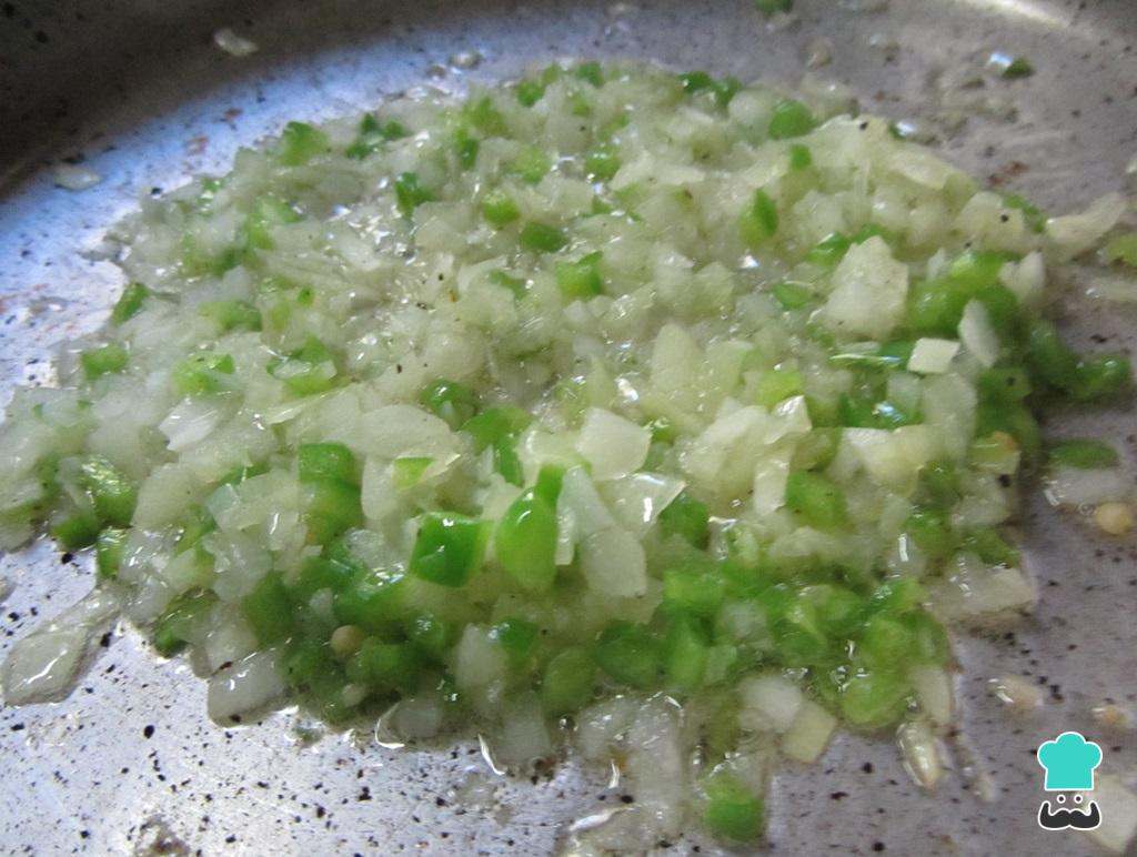 Coloque um pouco de azeite em uma frigideira e frite levemente a cebola e o pimentão.