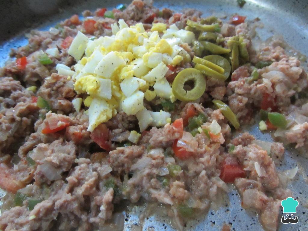 Adicione à mistura o atum, o ovo cozido picado e as azeitonas. O recheio da empada de atum argentina está completo. Misture bem e deixe esfriar.