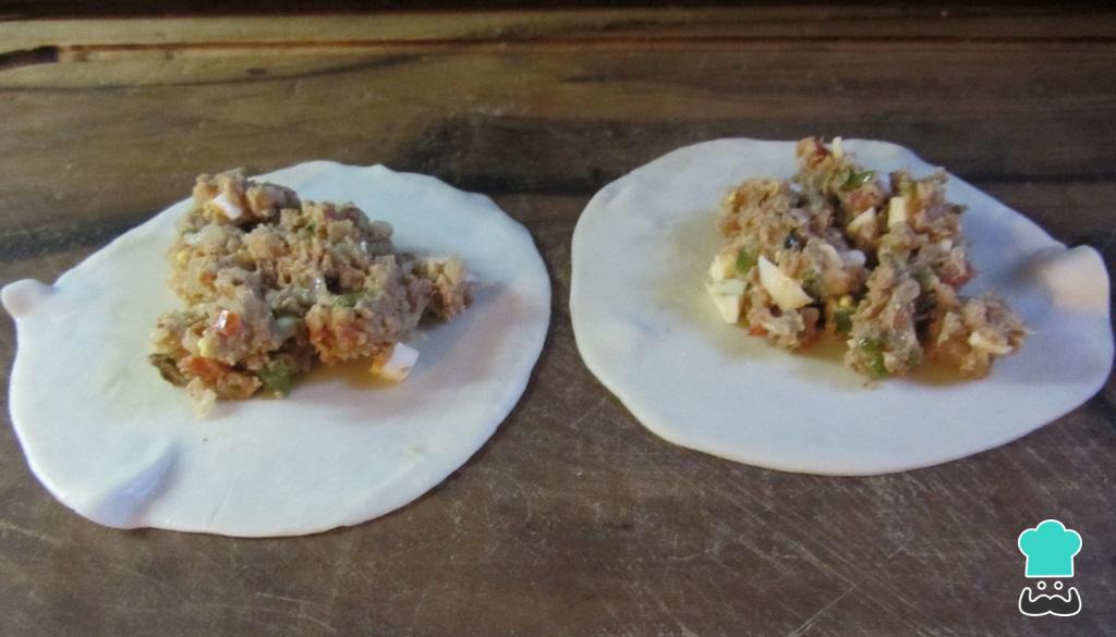 Coloque uma colher de sopa do recheio de atum em cada círculo de massa.