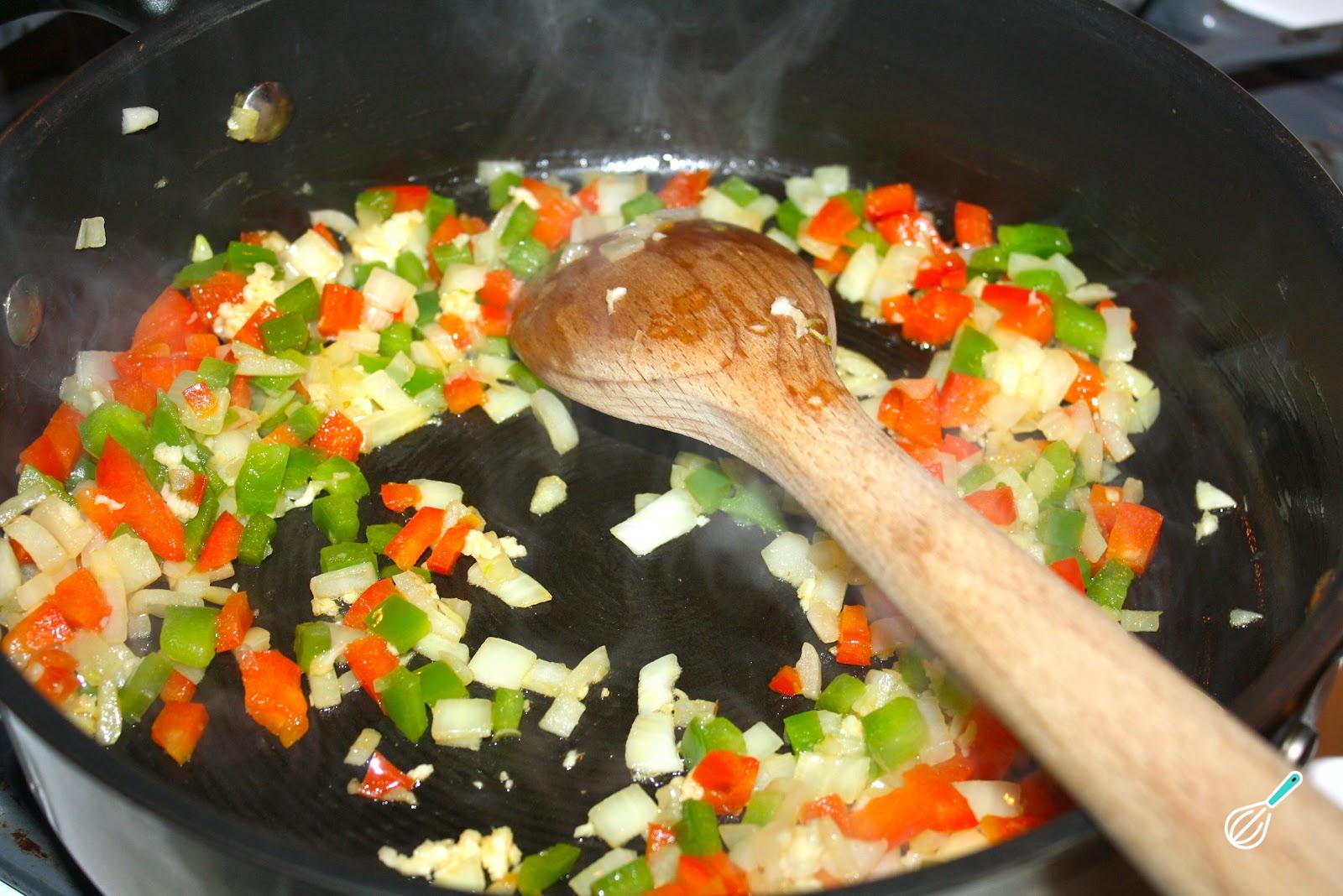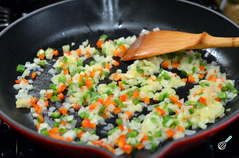 Para começar a preparar o recheio da empanada de frango simples, você deve fazer os legumes salteados. Para fazer isso, refogue as cebolas junto com o pimentão finamente picado.