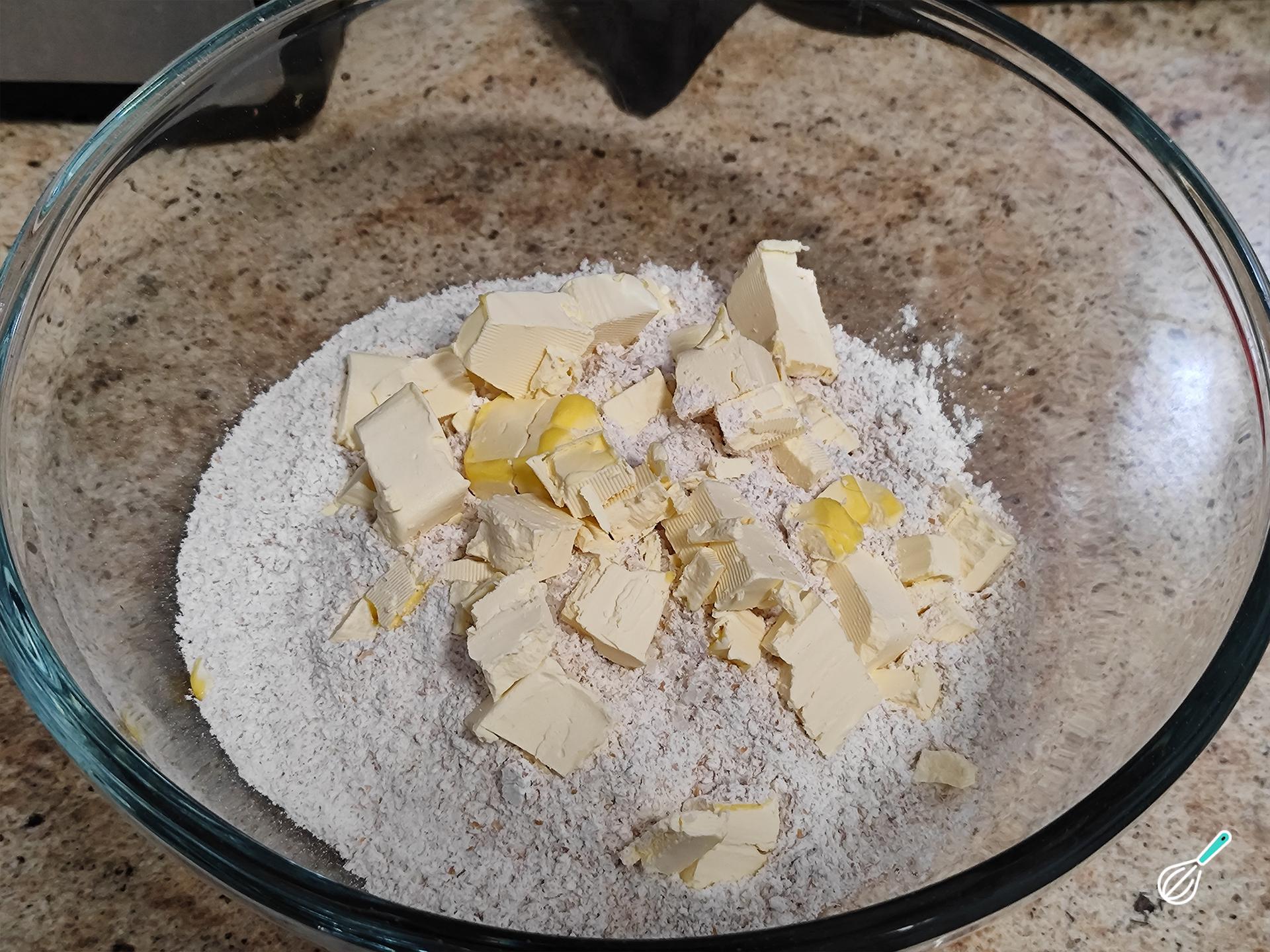 Comece a receita preparando a massa das empanadas. Em uma tigela grande, misture a farinha, o sal e a manteiga — esta última deve estar fria e em cubos. Misture com as mãos limpas até obter uma textura arenosa.