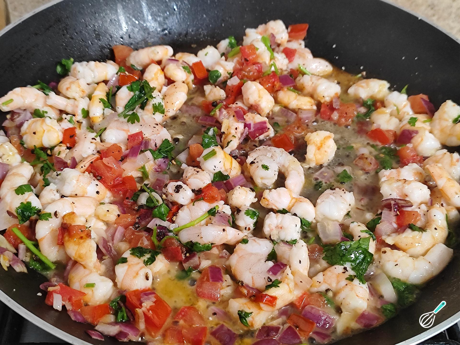 Para finalizar o recheio das empanadas de camarão, adicione o suco de limão, sal, pimenta e cominho a gosto. Cozinhe tudo por 3 a 4 minutos, depois adicione o coentro picado, misture bem e retire do fogo.