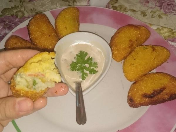 Fiz com a farinha de de milho (cuzcuz) e deu certo só faltou i açafrão da terra.