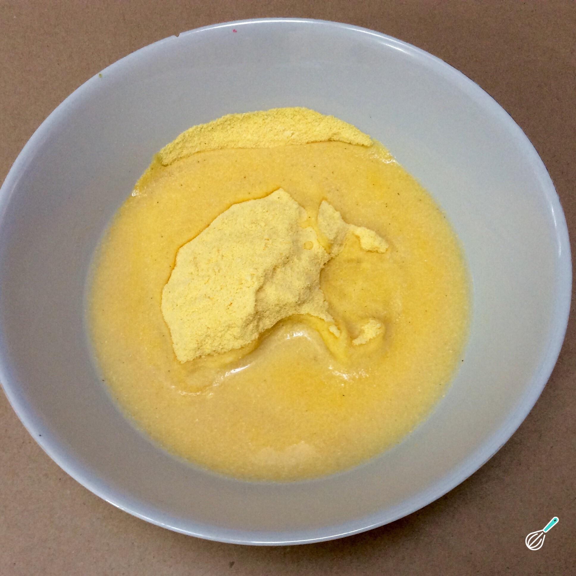 Coloque a farinha de milho amarela em uma tigela grande e adicione um copo de água morna, deixe descansar por 1 minuto.