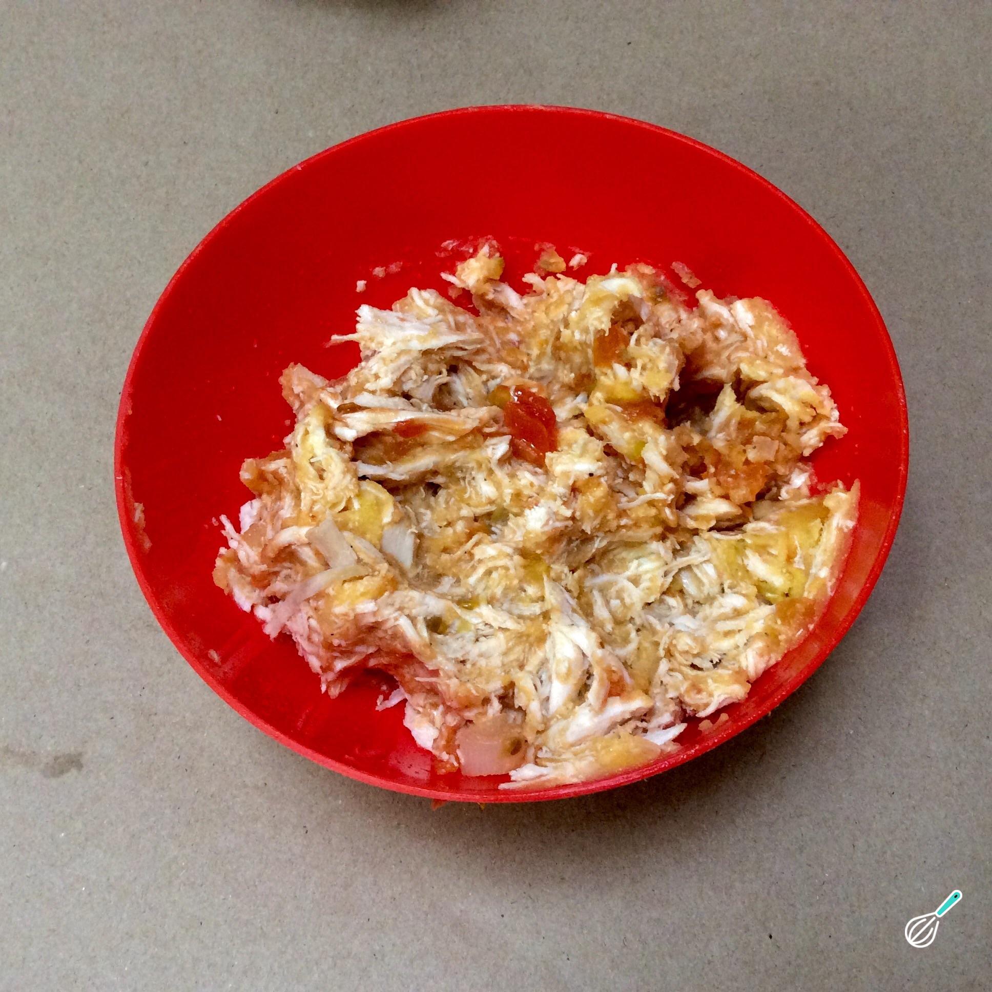 Em uma tigela à parte misture o frango, as batatas e a pasta ou molho de tomate. Retifique o sabor com sal e pimenta a gosto.