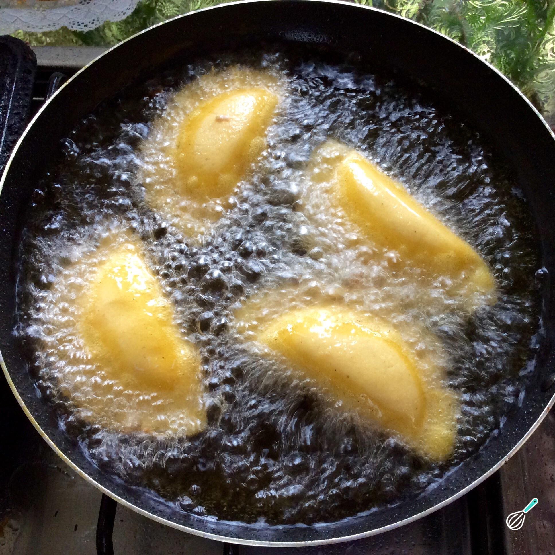 Frite as empanas em óleo quente até que estejam bem douradas. Retire para um prato com papel absorvente e deixe escorrer o excesso de óleo.