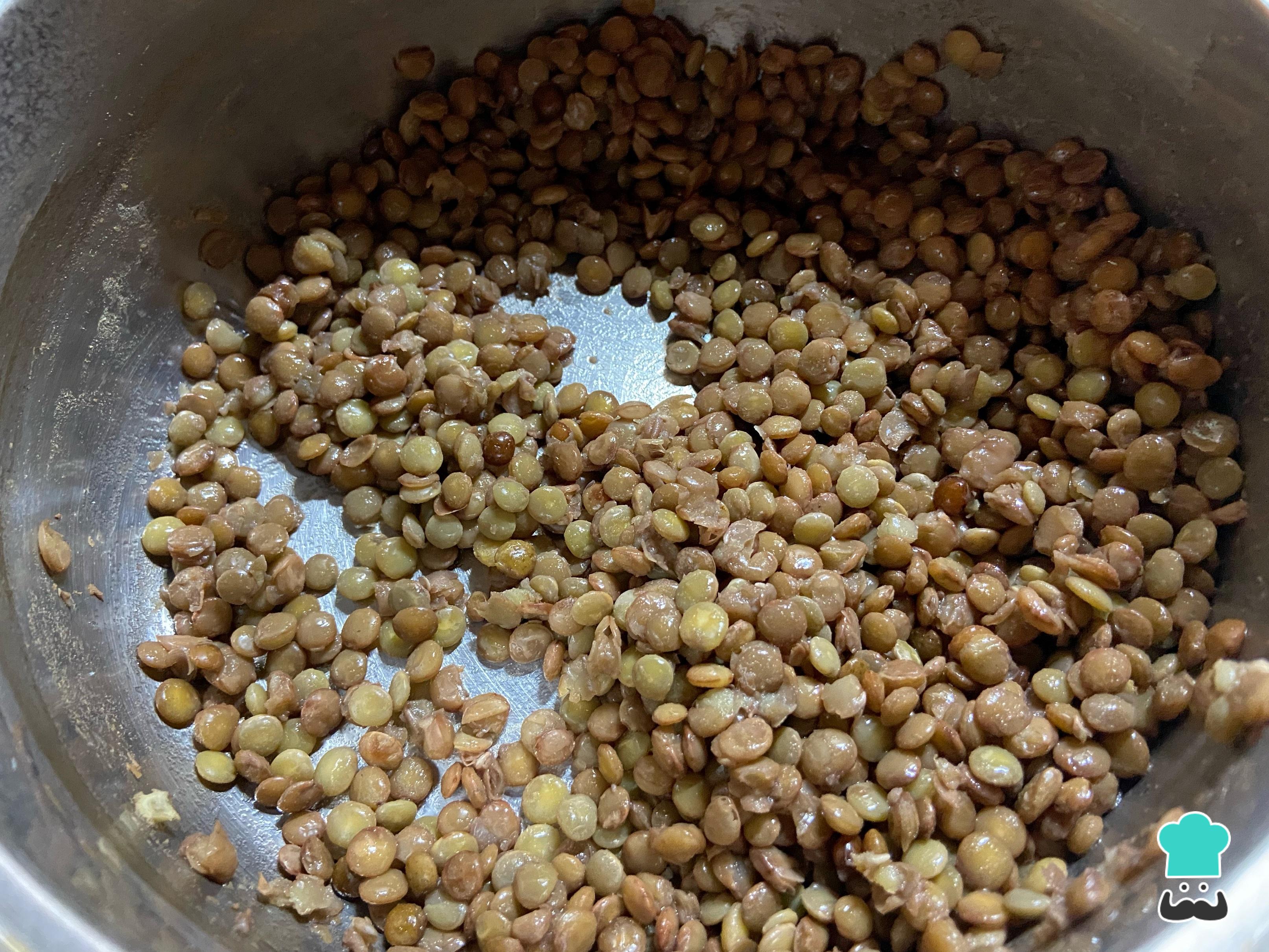 Para começar esta receita de empanadas veganas com recheio de lentilha, primeiro cozinhe as lentilhas em bastante água fervente por 30 minutos. Com a ajuda de um coador, retire a água da cozedura e reserve as lentilhas enquanto esfriam.