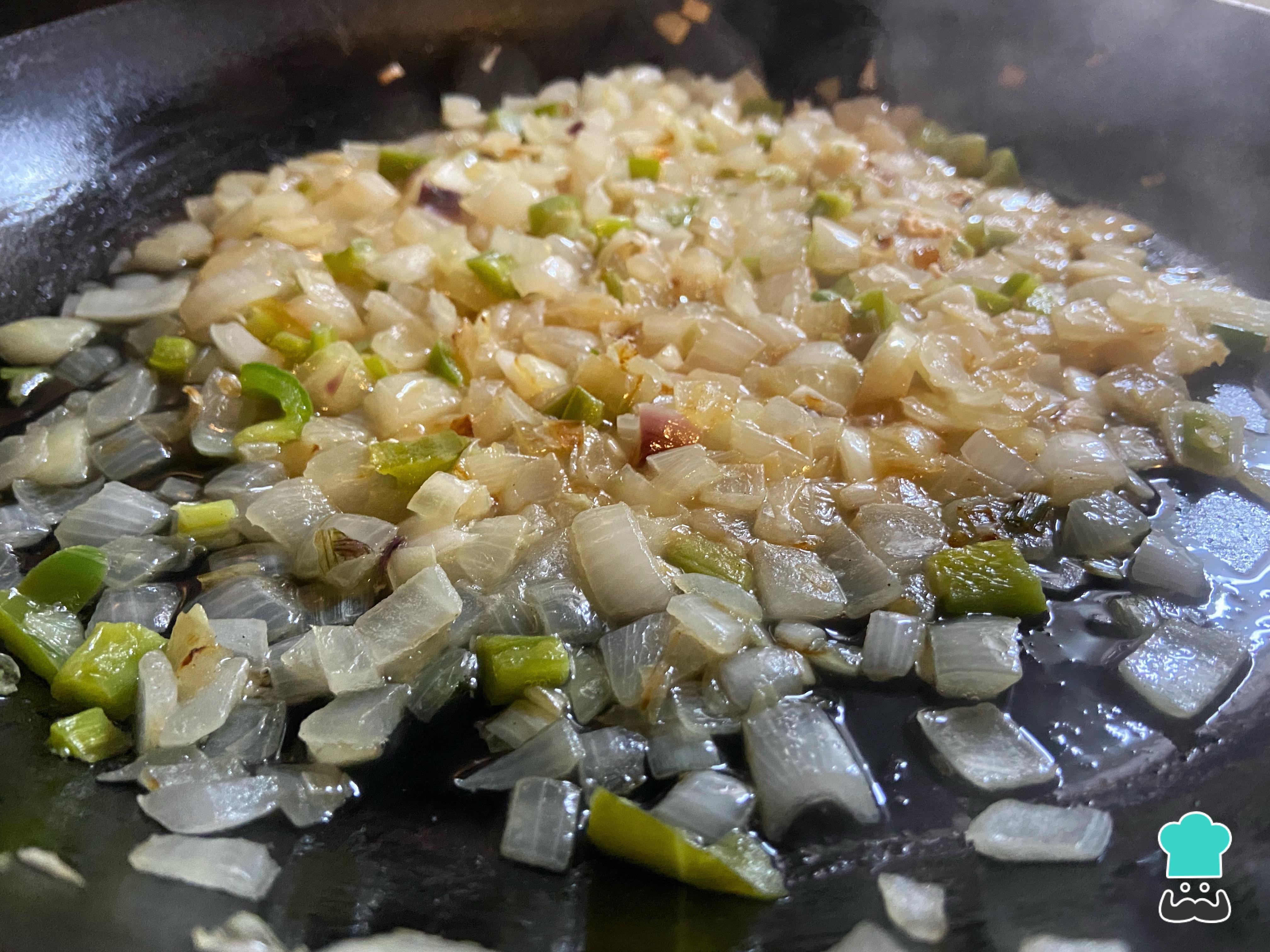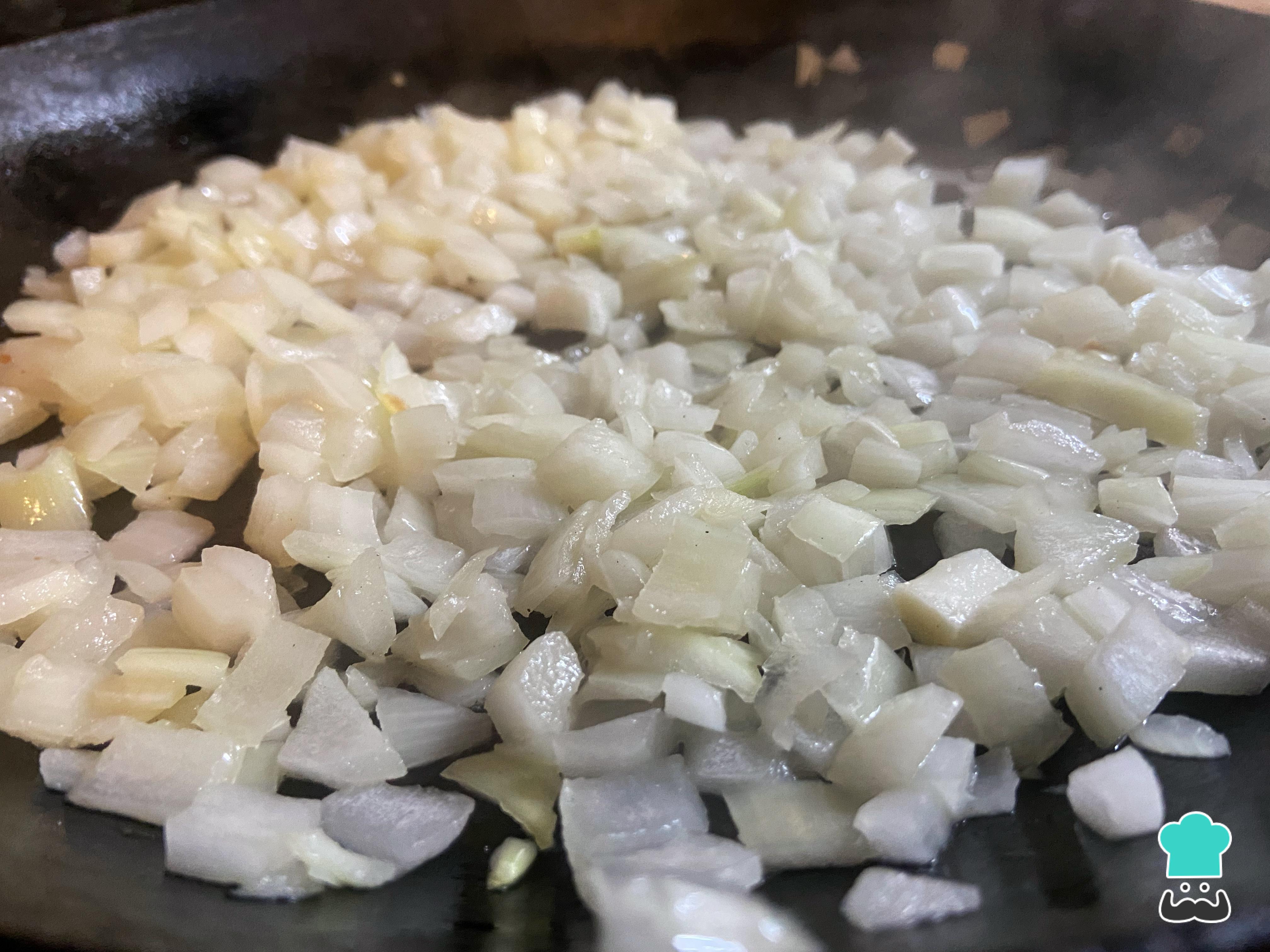 Refogue a cebola branca com 1 colher de chá de óleo em uma frigideira em fogo alto até ficar translúcida.
