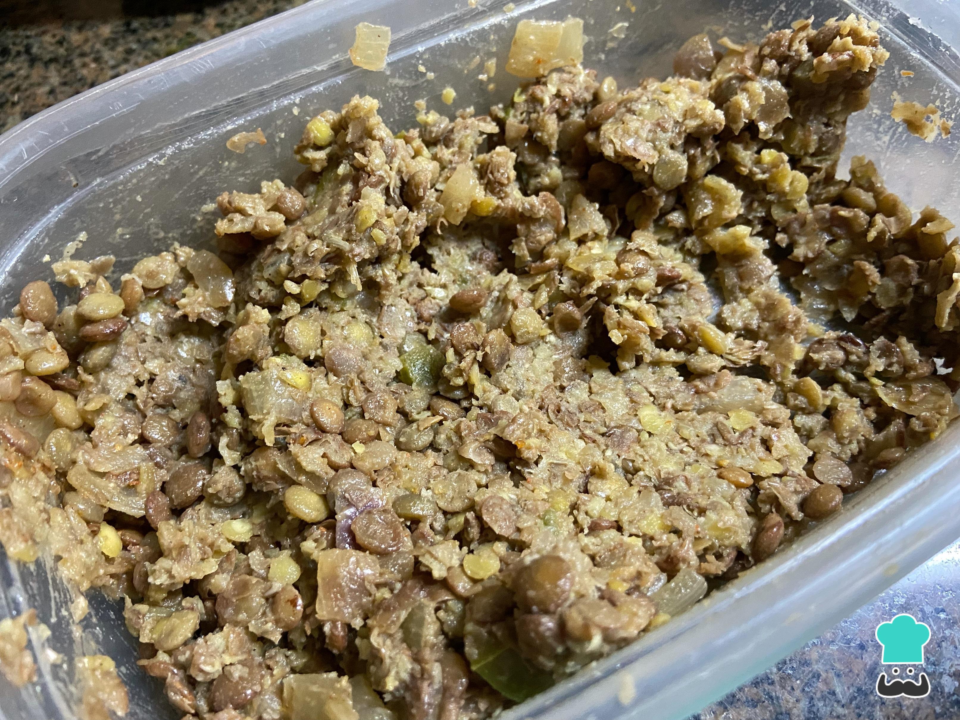 Quando o álcool evaporar, misture os legumes com as lentilhas e use um triturador e misturador para formar um recheio mais pastoso. Guarde-o para esfriar, de preferência, uma noite, pois ganhará mais sabor.
