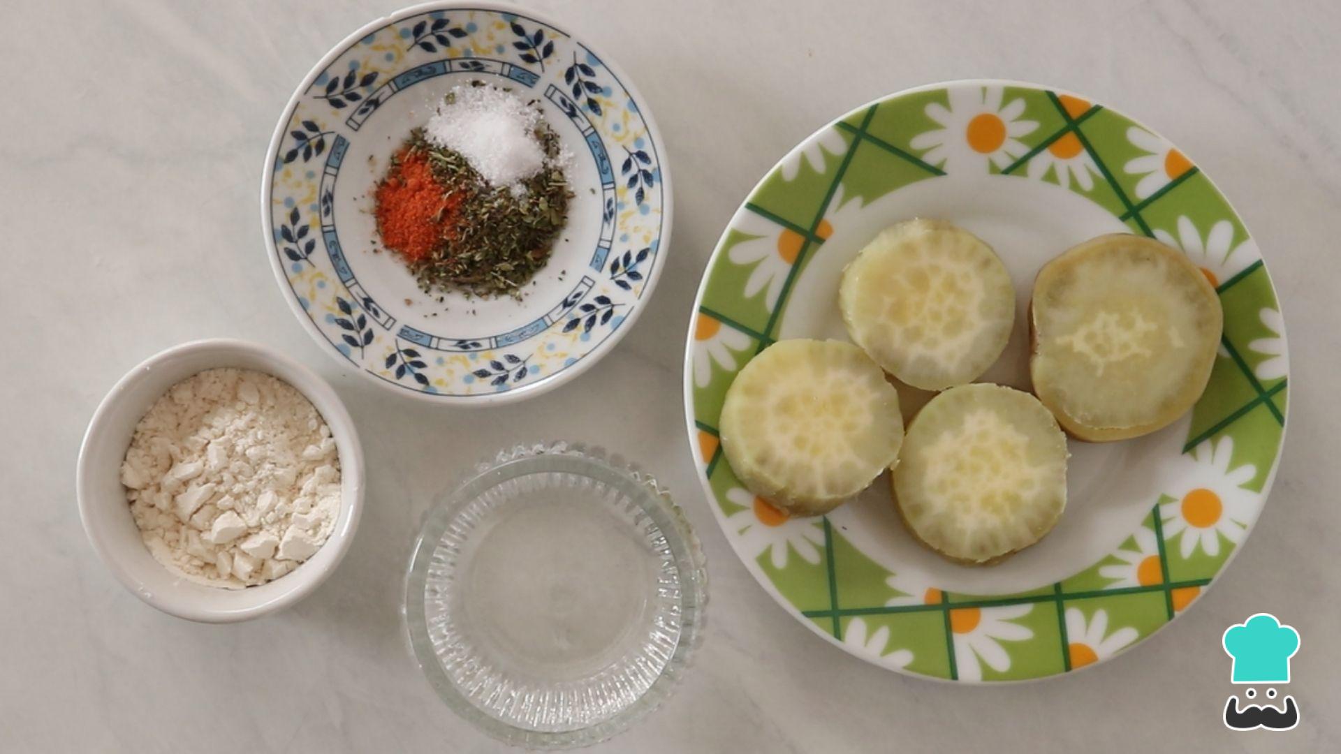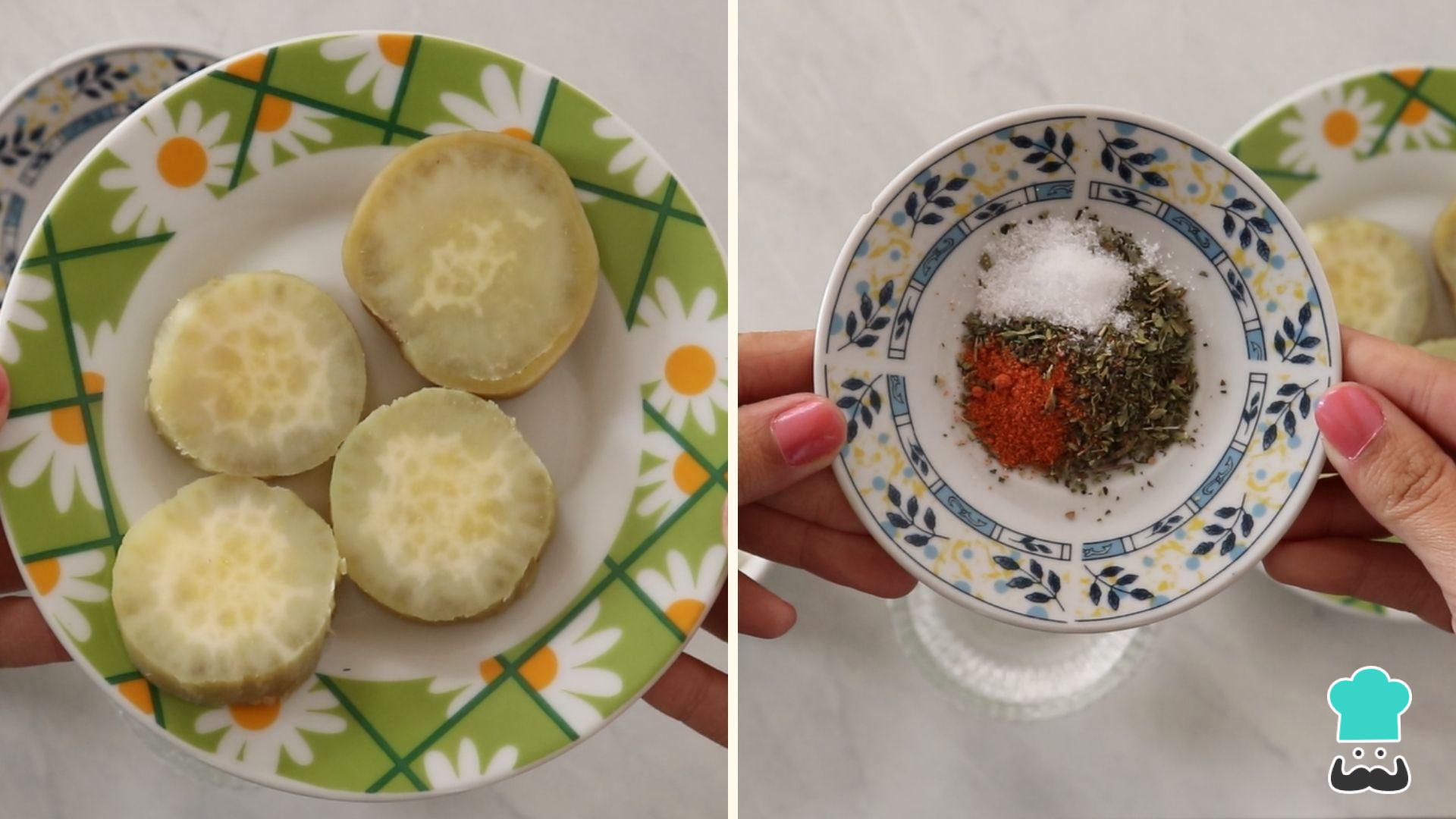 Corte em fatias grossas e pré-cozinhe a batata doce até ficar al-dente. Misture os temperos escolhidos: nossa sugestão é orégano, páprica doce e sal.