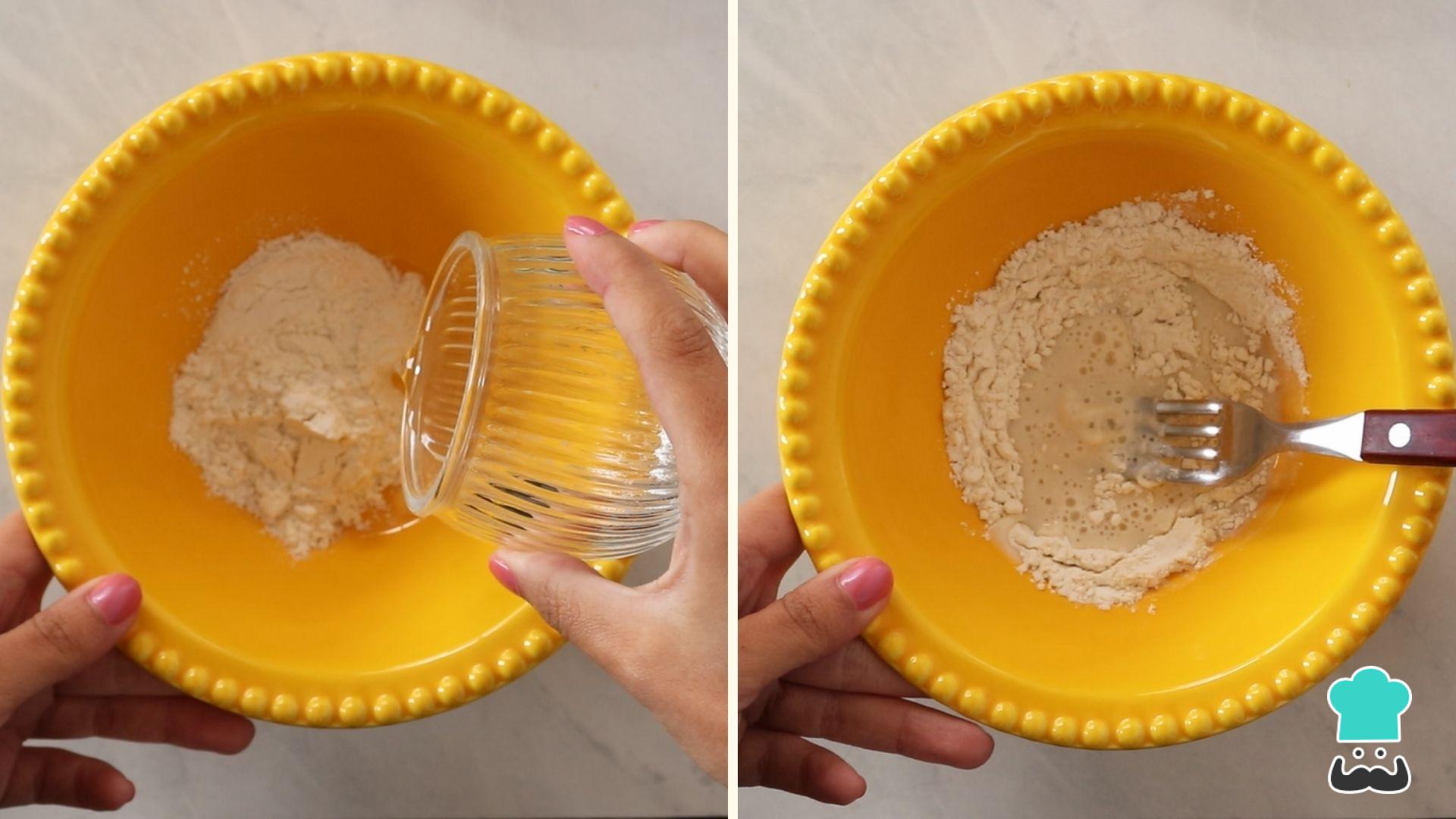Em uma tigela, coloque a farinha de trigo, adicione a água aos poucos e misture com um garfo.